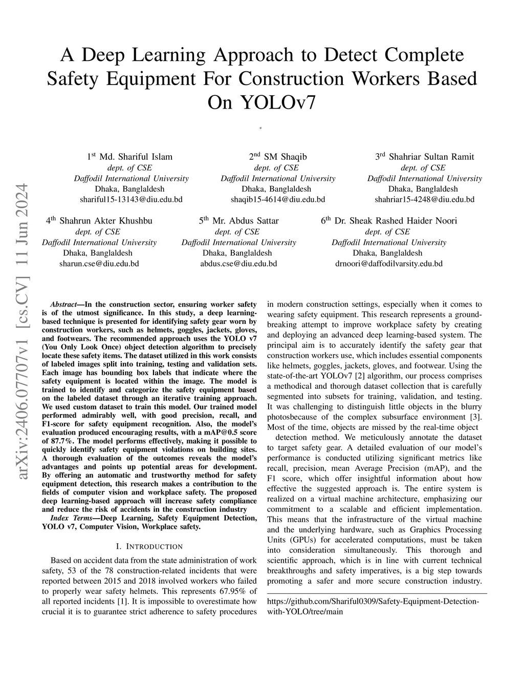In the construction sector, ensuring worker safety is of the utmost significance. In this study, a deep learning-based technique is presented for identifying safety gear worn by construction workers, such as helmets, goggles, jackets, gloves, and footwears. The recommended approach uses the YOLO v7 (You Only Look Once) object detection algorithm to precisely locate these safety items. The dataset utilized in this work consists of labeled images split into training, testing and validation sets. Each image has bounding box labels that indicate where the safety equipment is located within the image. The model is trained to identify and categorize the safety equipment based on the labeled dataset through an iterative training approach. We used custom dataset to train this model. Our trained model performed admirably well, with good precision, recall, and F1-score for safety equipment recognition. Also, the model's evaluation produced encouraging results, with a mAP@0.5 score of 87.7\%. The model performs effectively, making it possible to quickly identify safety equipment violations on building sites. A thorough evaluation of the outcomes reveals the model's advantages and points up potential areas for development. By offering an automatic and trustworthy method for safety equipment detection, this research makes a contribution to the fields of computer vision and workplace safety. The proposed deep learning-based approach will increase safety compliance and reduce the risk of accidents in the construction industry