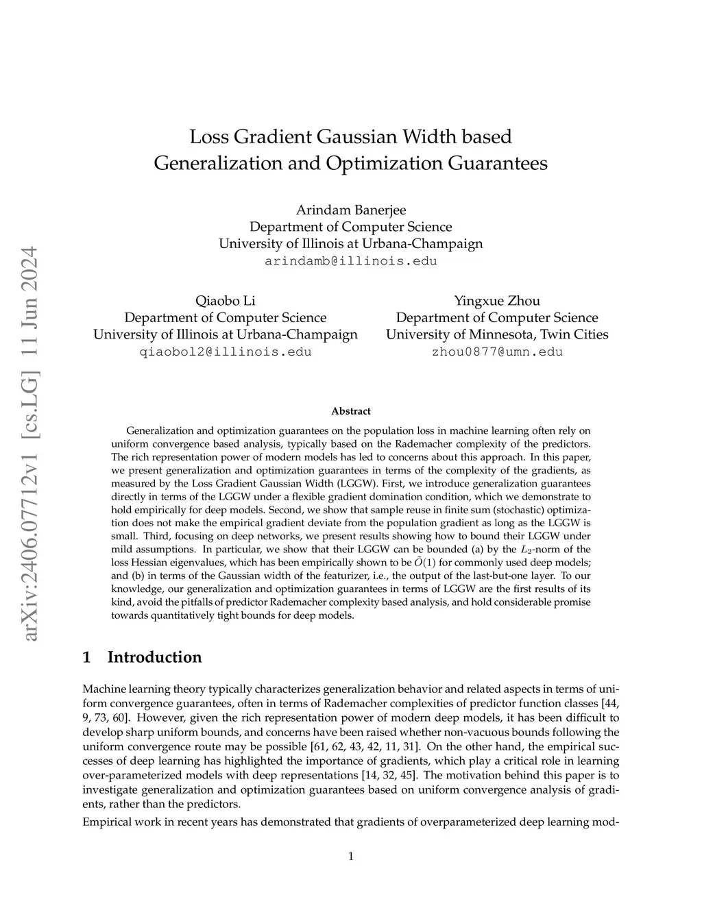 Loss Gradient Gaussian Width based Generalization and Optimization Guarantees