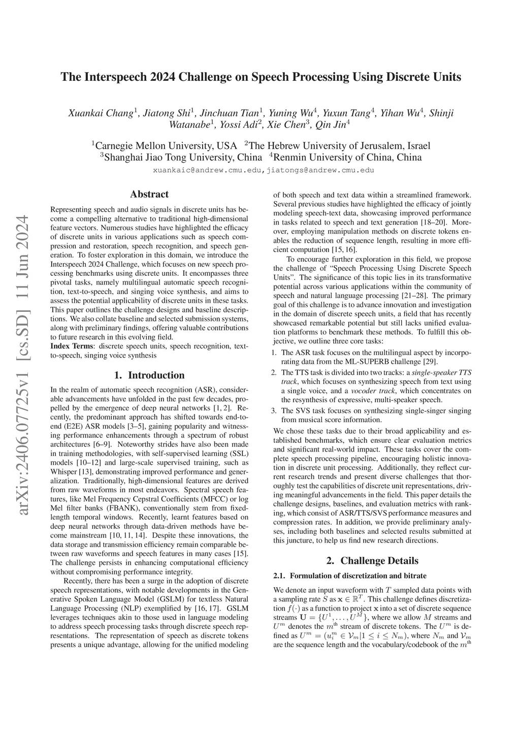Representing speech and audio signals in discrete units has become a compelling alternative to traditional high-dimensional feature vectors. Numerous studies have highlighted the efficacy of discrete units in various applications such as speech compression and restoration, speech recognition, and speech generation. To foster exploration in this domain, we introduce the Interspeech 2024 Challenge, which focuses on new speech processing benchmarks using discrete units. It encompasses three pivotal tasks, namely multilingual automatic speech recognition, text-to-speech, and singing voice synthesis, and aims to assess the potential applicability of discrete units in these tasks. This paper outlines the challenge designs and baseline descriptions. We also collate baseline and selected submission systems, along with preliminary findings, offering valuable contributions to future research in this evolving field.