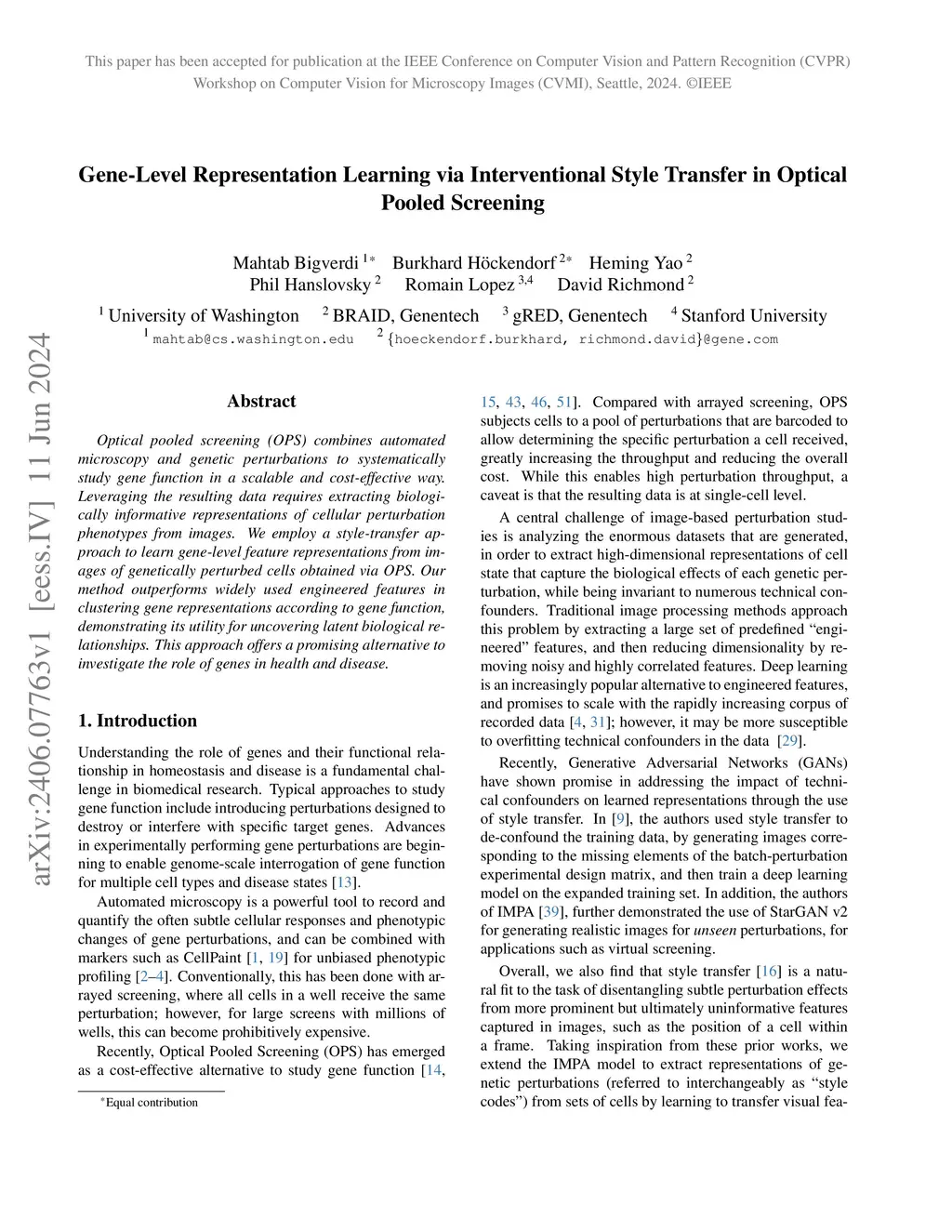 Optical pooled screening (OPS) combines automated microscopy and genetic perturbations to systematically study gene function in a scalable and cost-effective way. Leveraging the resulting data requires extracting biologically informative representations of cellular perturbation phenotypes from images. We employ a style-transfer approach to learn gene-level feature representations from images of genetically perturbed cells obtained via OPS. Our method outperforms widely used engineered features in clustering gene representations according to gene function, demonstrating its utility for uncovering latent biological relationships. This approach offers a promising alternative to investigate the role of genes in health and disease.