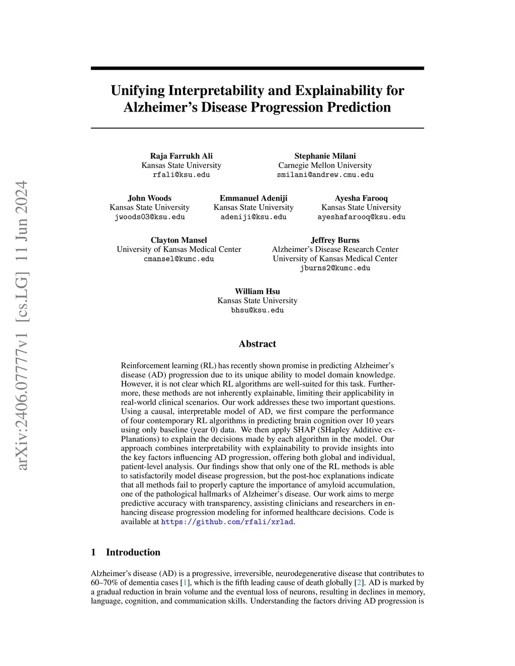 Reinforcement learning (RL) has recently shown promise in predicting Alzheimer's disease (AD) progression due to its unique ability to model domain knowledge. However, it is not clear which RL algorithms are well-suited for this task. Furthermore, these methods are not inherently explainable, limiting their applicability in real-world clinical scenarios. Our work addresses these two important questions. Using a causal, interpretable model of AD, we first compare the performance of four contemporary RL algorithms in predicting brain cognition over 10 years using only baseline (year 0) data. We then apply SHAP (SHapley Additive exPlanations) to explain the decisions made by each algorithm in the model. Our approach combines interpretability with explainability to provide insights into the key factors influencing AD progression, offering both global and individual, patient-level analysis. Our findings show that only one of the RL methods is able to satisfactorily model disease progression, but the post-hoc explanations indicate that all methods fail to properly capture the importance of amyloid accumulation, one of the pathological hallmarks of Alzheimer's disease. Our work aims to merge predictive accuracy with transparency, assisting clinicians and researchers in enhancing disease progression modeling for informed healthcare decisions. Code is available at https://github.com/rfali/xrlad.
