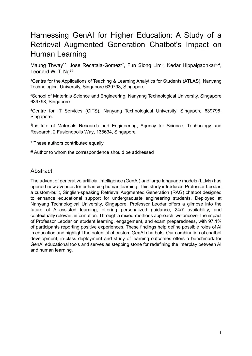 Generative artificial intelligence (GenAI) and large language models (LLMs) have simultaneously opened new avenues for enhancing human learning and increased the prevalence of poor-quality information in student response - termed Botpoop. This study introduces Professor Leodar, a custom-built, Singlish-speaking Retrieval Augmented Generation (RAG) chatbot designed to enhance educational while reducing Botpoop. Deployed at Nanyang Technological University, Singapore, Professor Leodar offers a glimpse into the future of AI-assisted learning, offering personalized guidance, 24/7 availability, and contextually relevant information. Through a mixed-methods approach, we examine the impact of Professor Leodar on learning, engagement, and exam preparedness, with 97.1% of participants reporting positive experiences. These findings help define possible roles of AI in education and highlight the potential of custom GenAI chatbots. Our combination of chatbot development, in-class deployment and outcomes study offers a benchmark for GenAI educational tools and is a stepping stone for redefining the interplay between AI and human learning.