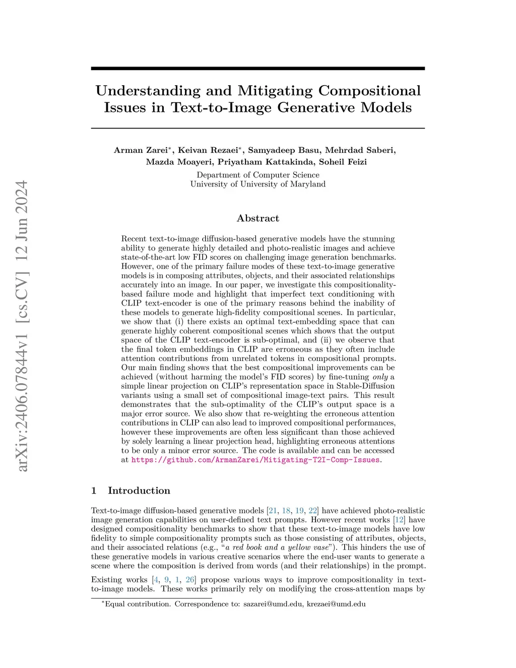 Text-to-image diffusion-based generative models have the stunning ability to generate photo-realistic images and achieve state-of-the-art low FID scores on challenging image generation benchmarks. However, one of the primary failure modes of these text-to-image generative models is in composing attributes, objects, and their associated relationships accurately into an image. In our paper, we investigate compositional attribute binding failures, where the model fails to correctly associate descriptive attributes (such as color, shape, or texture) with the corresponding objects in the generated images, and highlight that imperfect text conditioning with CLIP text-encoder is one of the primary reasons behind the inability of these models to generate high-fidelity compositional scenes. In particular, we show that (i) there exists an optimal text-embedding space that can generate highly coherent compositional scenes showing that the output space of the CLIP text-encoder is sub-optimal, and (ii) the final token embeddings in CLIP are erroneous as they often include attention contributions from unrelated tokens in compositional prompts. Our main finding shows that significant compositional improvements can be achieved (without harming the model's FID score) by fine-tuning only a simple and parameter-efficient linear projection on CLIP's representation space in Stable-Diffusion variants using a small set of compositional image-text pairs.
