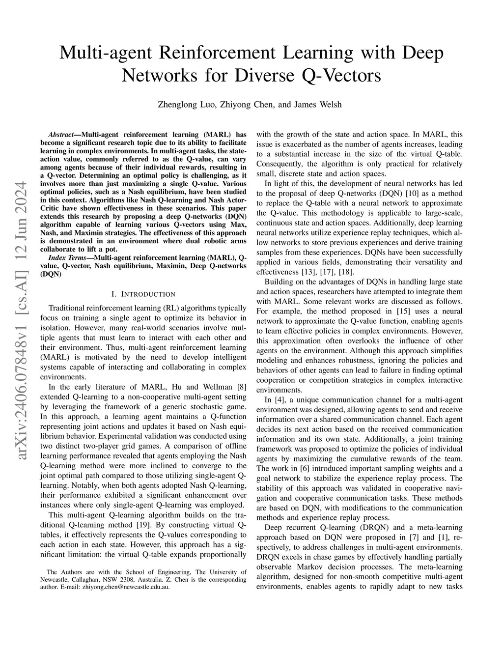Multi-agent reinforcement learning (MARL) has become a significant research topic due to its ability to facilitate learning in complex environments. In multi-agent tasks, the state-action value, commonly referred to as the Q-value, can vary among agents because of their individual rewards, resulting in a Q-vector. Determining an optimal policy is challenging, as it involves more than just maximizing a single Q-value. Various optimal policies, such as a Nash equilibrium, have been studied in this context. Algorithms like Nash Q-learning and Nash Actor-Critic have shown effectiveness in these scenarios. This paper extends this research by proposing a deep Q-networks (DQN) algorithm capable of learning various Q-vectors using Max, Nash, and Maximin strategies. The effectiveness of this approach is demonstrated in an environment where dual robotic arms collaborate to lift a pot.