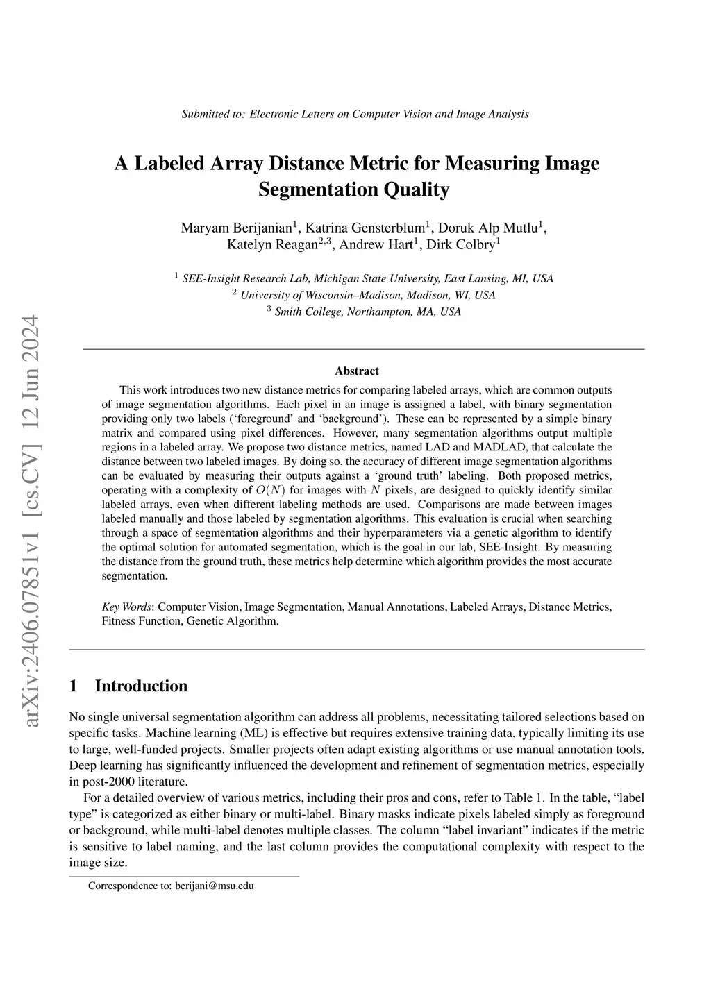 This work introduces two new distance metrics for comparing labeled arrays, which are common outputs of image segmentation algorithms. Each pixel in an image is assigned a label, with binary segmentation providing only two labels ('foreground' and 'background'). These can be represented by a simple binary matrix and compared using pixel differences. However, many segmentation algorithms output multiple regions in a labeled array. We propose two distance metrics, named LAD and MADLAD, that calculate the distance between two labeled images. By doing so, the accuracy of different image segmentation algorithms can be evaluated by measuring their outputs against a 'ground truth' labeling. Both proposed metrics, operating with a complexity of for images with pixels, are designed to quickly identify similar labeled arrays, even when different labeling methods are used. Comparisons are made between images labeled manually and those labeled by segmentation algorithms. This evaluation is crucial when searching through a space of segmentation algorithms and their hyperparameters via a genetic algorithm to identify the optimal solution for automated segmentation, which is the goal in our lab, SEE-Insight. By measuring the distance from the ground truth, these metrics help determine which algorithm provides the most accurate segmentation.