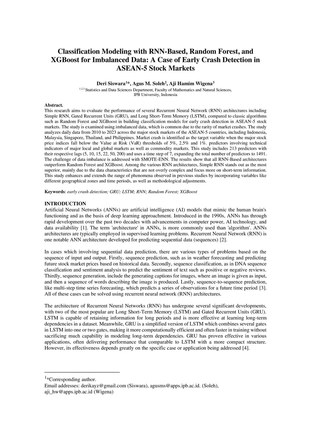 This research aims to evaluate the performance of several Recurrent Neural Network (RNN) architectures including Simple RNN, Gated Recurrent Units (GRU), and Long Short-Term Memory (LSTM), compared to classic algorithms such as Random Forest and XGBoost in building classification models for early crash detection in ASEAN-5 stock markets. The study is examined using imbalanced data, which is common due to the rarity of market crashes. The study analyzes daily data from 2010 to 2023 across the major stock markets of the ASEAN-5 countries, including Indonesia, Malaysia, Singapore, Thailand, and Philippines. Market crash is identified as the target variable when the major stock price indices fall below the Value at Risk (VaR) thresholds of 5%, 2.5% and 1%. predictors involving technical indicators of major local and global markets as well as commodity markets. This study includes 213 predictors with their respective lags (5, 10, 15, 22, 50, 200) and uses a time step of 7, expanding the total number of predictors to 1491. The challenge of data imbalance is addressed with SMOTE-ENN. The results show that all RNN-Based architectures outperform Random Forest and XGBoost. Among the various RNN architectures, Simple RNN stands out as the most superior, mainly due to the data characteristics that are not overly complex and focus more on short-term information. This study enhances and extends the range of phenomena observed in previous studies by incorporating variables like different geographical zones and time periods, as well as methodological adjustments.