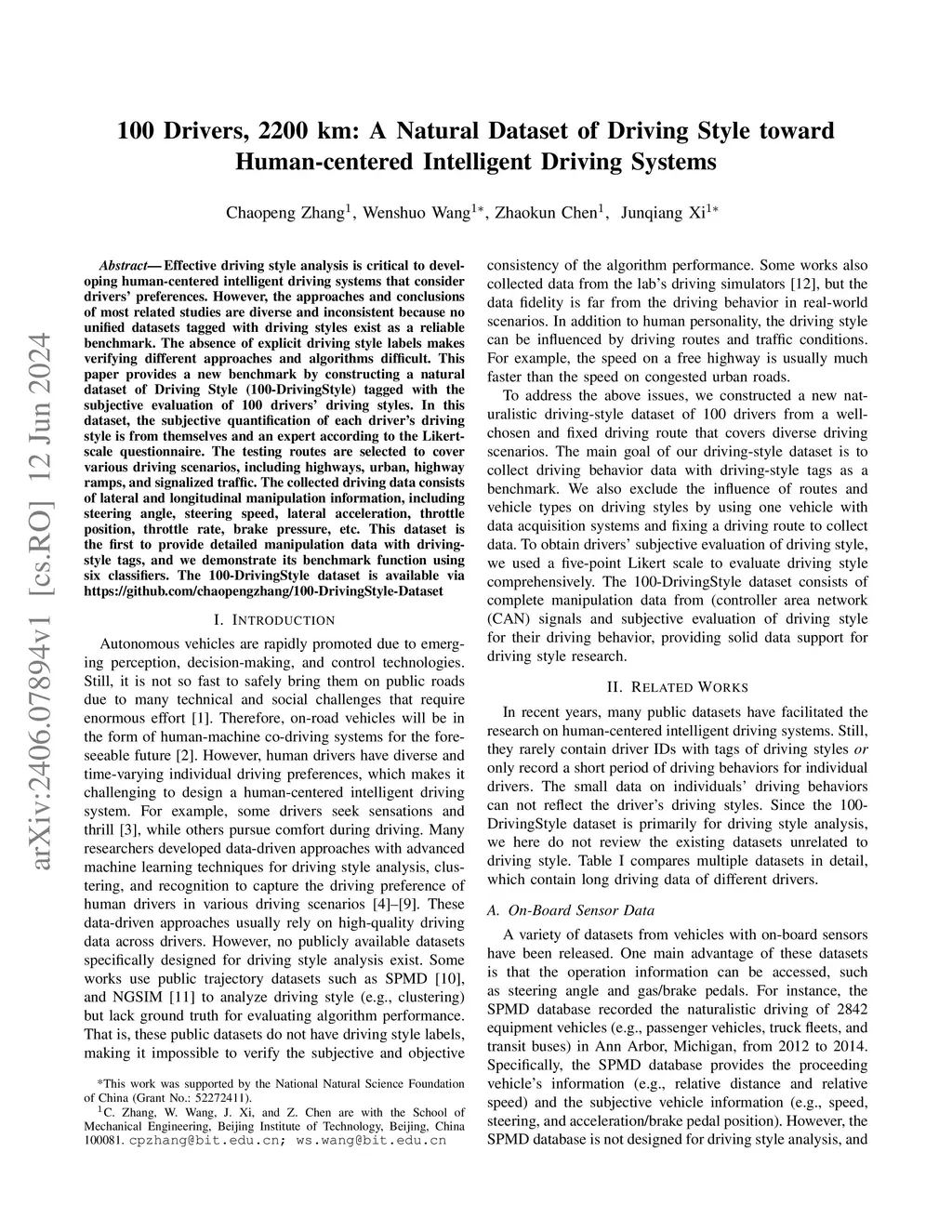 Effective driving style analysis is critical to developing human-centered intelligent driving systems that consider drivers' preferences. However, the approaches and conclusions of most related studies are diverse and inconsistent because no unified datasets tagged with driving styles exist as a reliable benchmark. The absence of explicit driving style labels makes verifying different approaches and algorithms difficult. This paper provides a new benchmark by constructing a natural dataset of Driving Style (100-DrivingStyle) tagged with the subjective evaluation of 100 drivers' driving styles. In this dataset, the subjective quantification of each driver's driving style is from themselves and an expert according to the Likert-scale questionnaire. The testing routes are selected to cover various driving scenarios, including highways, urban, highway ramps, and signalized traffic. The collected driving data consists of lateral and longitudinal manipulation information, including steering angle, steering speed, lateral acceleration, throttle position, throttle rate, brake pressure, etc. This dataset is the first to provide detailed manipulation data with driving-style tags, and we demonstrate its benchmark function using six classifiers. The 100-DrivingStyle dataset is available via https://github.com/chaopengzhang/100-DrivingStyle-Dataset