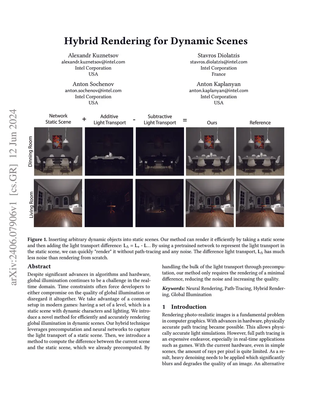 Despite significant advances in algorithms and hardware, global illumination continues to be a challenge in the real-time domain. Time constraints often force developers to either compromise on the quality of global illumination or disregard it altogether. We take advantage of a common setup in modern games: having a set of a level, which is a static scene with dynamic characters and lighting. We introduce a novel method for efficiently and accurately rendering global illumination in dynamic scenes. Our hybrid technique leverages precomputation and neural networks to capture the light transport of a static scene. Then, we introduce a method to compute the difference between the current scene and the static scene, which we already precomputed. By handling the bulk of the light transport through precomputation, our method only requires the rendering of a minimal difference, reducing the noise and increasing the quality.