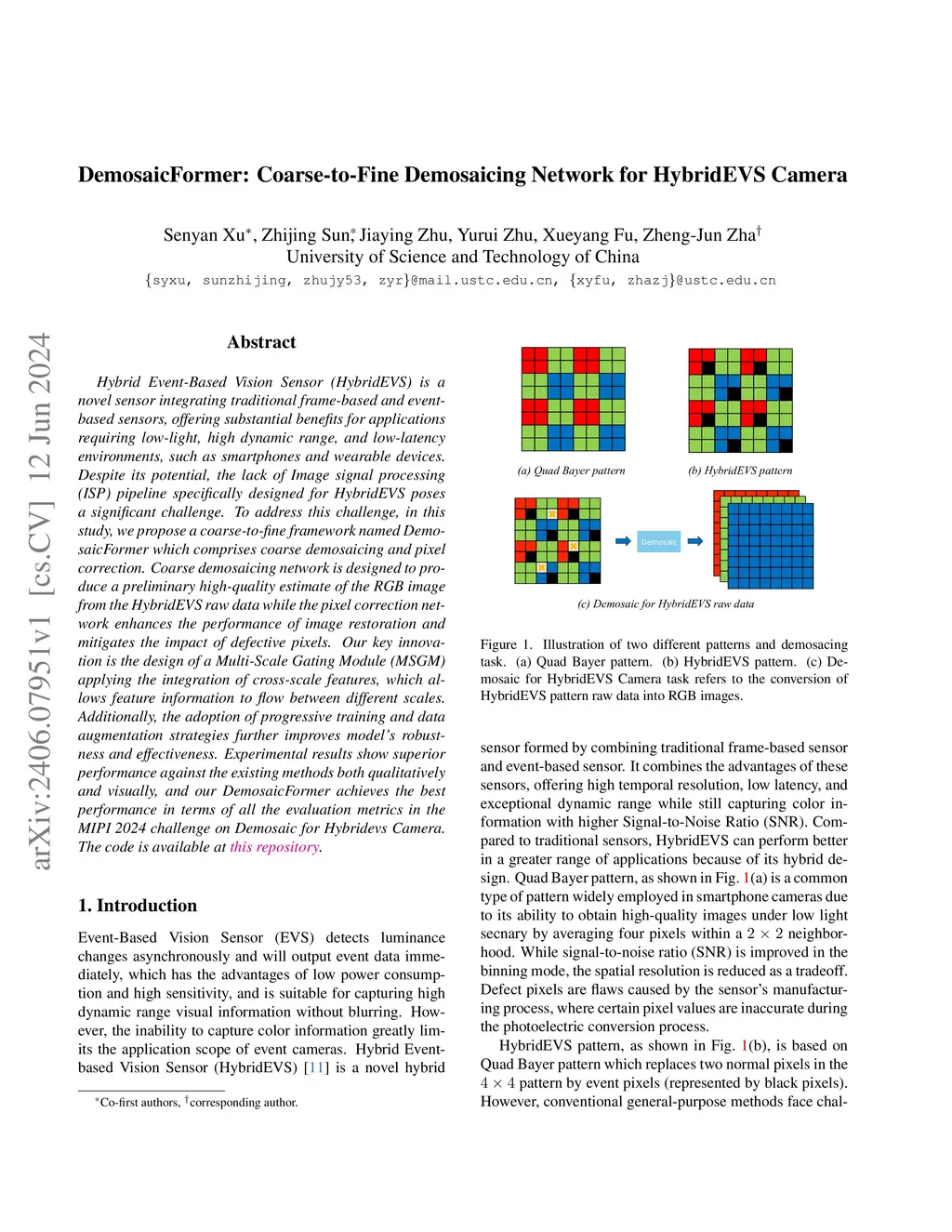 Hybrid Event-Based Vision Sensor (HybridEVS) is a novel sensor integrating traditional frame-based and event-based sensors, offering substantial benefits for applications requiring low-light, high dynamic range, and low-latency environments, such as smartphones and wearable devices. Despite its potential, the lack of Image signal processing (ISP) pipeline specifically designed for HybridEVS poses a significant challenge. To address this challenge, in this study, we propose a coarse-to-fine framework named DemosaicFormer which comprises coarse demosaicing and pixel correction. Coarse demosaicing network is designed to produce a preliminary high-quality estimate of the RGB image from the HybridEVS raw data while the pixel correction network enhances the performance of image restoration and mitigates the impact of defective pixels. Our key innovation is the design of a Multi-Scale Gating Module (MSGM) applying the integration of cross-scale features, which allows feature information to flow between different scales. Additionally, the adoption of progressive training and data augmentation strategies further improves model's robustness and effectiveness. Experimental results show superior performance against the existing methods both qualitatively and visually, and our DemosaicFormer achieves the best performance in terms of all the evaluation metrics in the MIPI 2024 challenge on Demosaic for Hybridevs Camera. The code is available at https://github.com/QUEAHREN/DemosaicFormer.