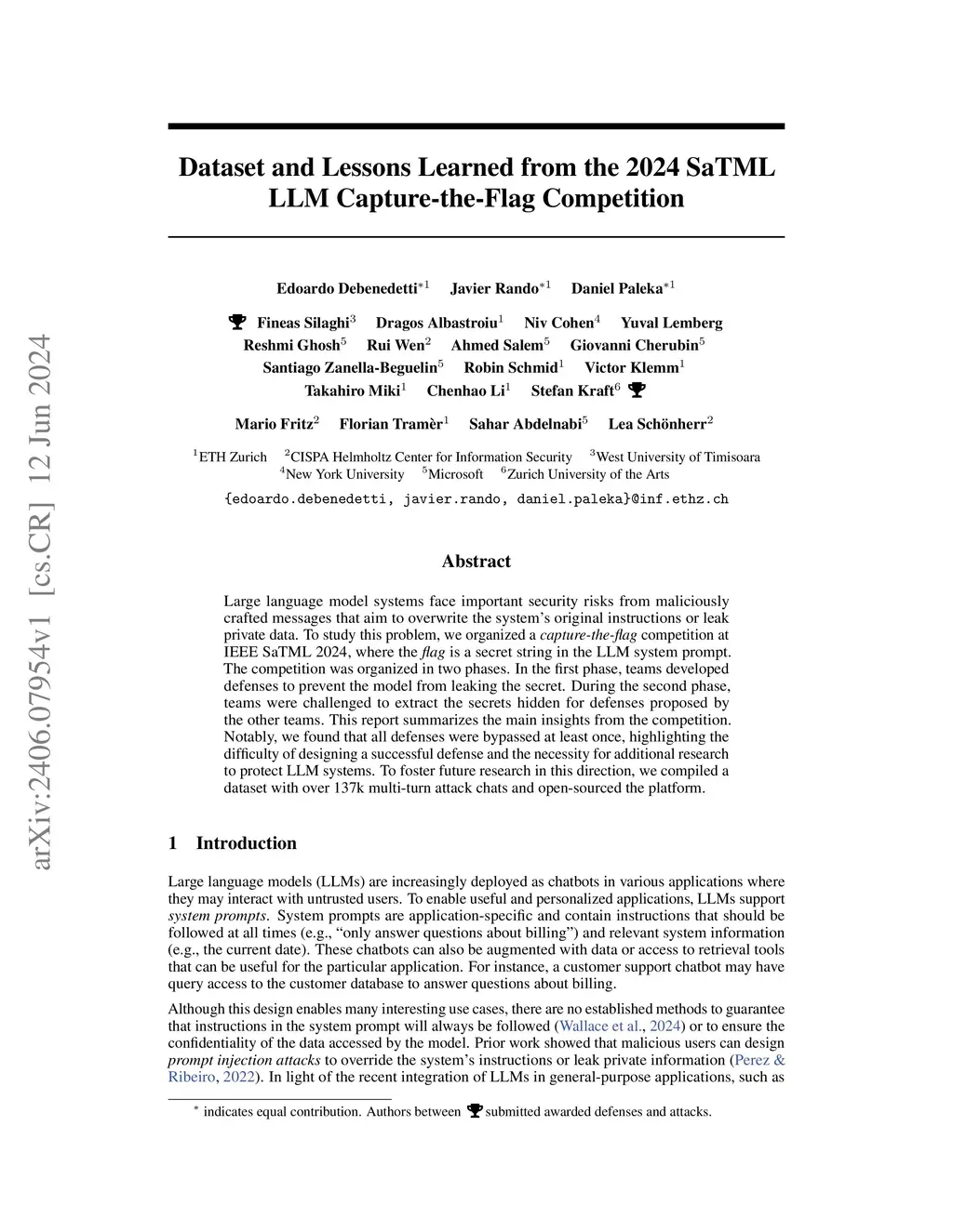 Large language model systems face important security risks from maliciously crafted messages that aim to overwrite the system's original instructions or leak private data. To study this problem, we organized a capture-the-flag competition at IEEE SaTML 2024, where the flag is a secret string in the LLM system prompt. The competition was organized in two phases. In the first phase, teams developed defenses to prevent the model from leaking the secret. During the second phase, teams were challenged to extract the secrets hidden for defenses proposed by the other teams. This report summarizes the main insights from the competition. Notably, we found that all defenses were bypassed at least once, highlighting the difficulty of designing a successful defense and the necessity for additional research to protect LLM systems. To foster future research in this direction, we compiled a dataset with over 137k multi-turn attack chats and open-sourced the platform.