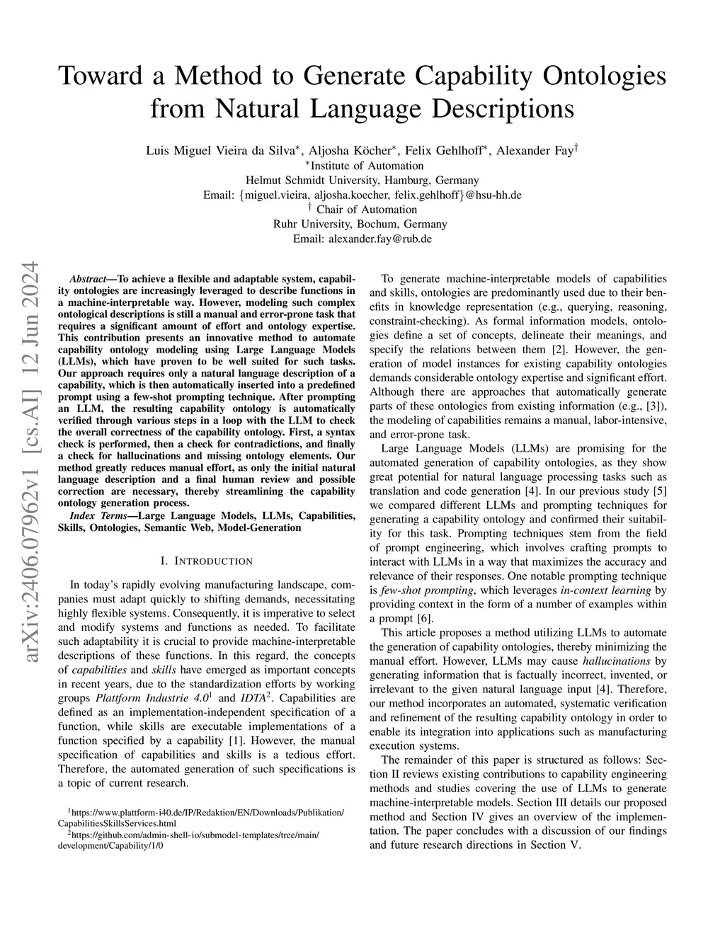 To achieve a flexible and adaptable system, capability ontologies are increasingly leveraged to describe functions in a machine-interpretable way. However, modeling such complex ontological descriptions is still a manual and error-prone task that requires a significant amount of effort and ontology expertise. This contribution presents an innovative method to automate capability ontology modeling using Large Language Models (LLMs), which have proven to be well suited for such tasks. Our approach requires only a natural language description of a capability, which is then automatically inserted into a predefined prompt using a few-shot prompting technique. After prompting an LLM, the resulting capability ontology is automatically verified through various steps in a loop with the LLM to check the overall correctness of the capability ontology. First, a syntax check is performed, then a check for contradictions, and finally a check for hallucinations and missing ontology elements. Our method greatly reduces manual effort, as only the initial natural language description and a final human review and possible correction are necessary, thereby streamlining the capability ontology generation process.