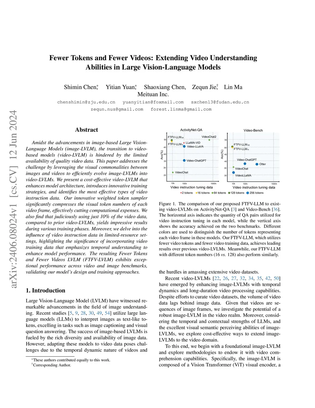 Amidst the advancements in image-based Large Vision-Language Models (image-LVLM), the transition to video-based models (video-LVLM) is hindered by the limited availability of quality video data. This paper addresses the challenge by leveraging the visual commonalities between images and videos to efficiently evolve image-LVLMs into video-LVLMs. We present a cost-effective video-LVLM that enhances model architecture, introduces innovative training strategies, and identifies the most effective types of video instruction data. Our innovative weighted token sampler significantly compresses the visual token numbers of each video frame, effectively cutting computational expenses. We also find that judiciously using just 10% of the video data, compared to prior video-LVLMs, yields impressive results during various training phases. Moreover, we delve into the influence of video instruction data in limited-resource settings, highlighting the significance of incorporating video training data that emphasizes temporal understanding to enhance model performance. The resulting Fewer Tokens and Fewer Videos LVLM (FTFV-LVLM) exhibits exceptional performance across video and image benchmarks, validating our model's design and training approaches.