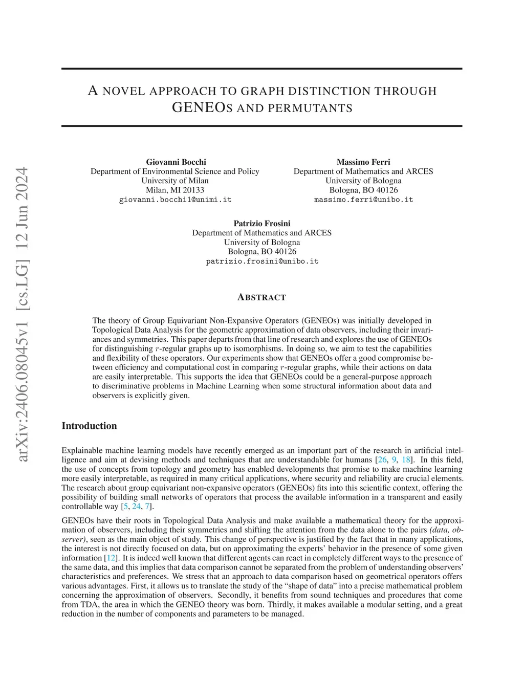 The theory of Group Equivariant Non-Expansive Operators (GENEOs) was initially developed in Topological Data Analysis for the geometric approximation of data observers, including their invariances and symmetries. This paper departs from that line of research and explores the use of GENEOs for distinguishing -regular graphs up to isomorphisms. In doing so, we aim to test the capabilities and flexibility of these operators. Our experiments show that GENEOs offer a good compromise between efficiency and computational cost in comparing -regular graphs, while their actions on data are easily interpretable. This supports the idea that GENEOs could be a general-purpose approach to discriminative problems in Machine Learning when some structural information about data and observers is explicitly given.