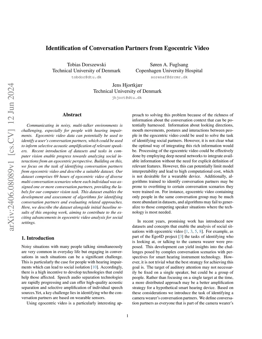 Communicating in noisy, multi-talker environments is challenging, especially for people with hearing impairments. Egocentric video data can potentially be used to identify a user's conversation partners, which could be used to inform selective acoustic amplification of relevant speakers. Recent introduction of datasets and tasks in computer vision enable progress towards analyzing social interactions from an egocentric perspective. Building on this, we focus on the task of identifying conversation partners from egocentric video and describe a suitable dataset. Our dataset comprises 69 hours of egocentric video of diverse multi-conversation scenarios where each individual was assigned one or more conversation partners, providing the labels for our computer vision task. This dataset enables the development and assessment of algorithms for identifying conversation partners and evaluating related approaches. Here, we describe the dataset alongside initial baseline results of this ongoing work, aiming to contribute to the exciting advancements in egocentric video analysis for social settings.