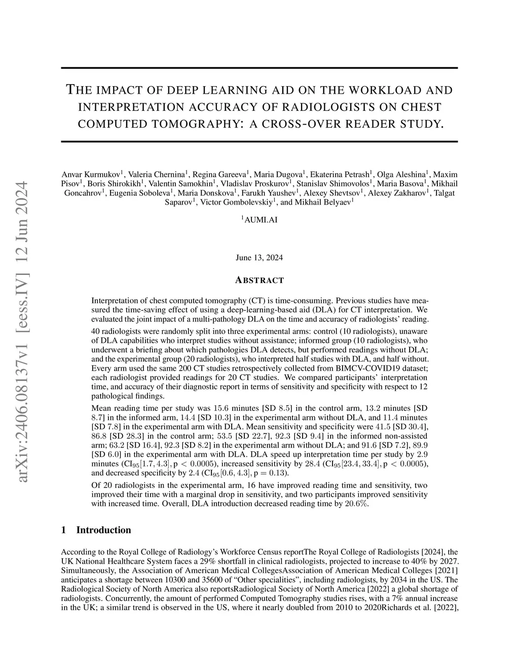 Interpretation of chest computed tomography (CT) is time-consuming. Previous studies have measured the time-saving effect of using a deep-learning-based aid (DLA) for CT interpretation. We evaluated the joint impact of a multi-pathology DLA on the time and accuracy of radiologists' reading. 40 radiologists were randomly split into three experimental arms: control (10), who interpret studies without assistance; informed group (10), who were briefed about DLA pathologies, but performed readings without it; and the experimental group (20), who interpreted half studies with DLA, and half without. Every arm used the same 200 CT studies retrospectively collected from BIMCV-COVID19 dataset; each radiologist provided readings for 20 CT studies. We compared interpretation time, and accuracy of participants diagnostic report with respect to 12 pathological findings. Mean reading time per study was 15.6 minutes [SD 8.5] in the control arm, 13.2 minutes [SD 8.7] in the informed arm, 14.4 [SD 10.3] in the experimental arm without DLA, and 11.4 minutes [SD 7.8] in the experimental arm with DLA. Mean sensitivity and specificity were 41.5 [SD 30.4], 86.8 [SD 28.3] in the control arm; 53.5 [SD 22.7], 92.3 [SD 9.4] in the informed non-assisted arm; 63.2 [SD 16.4], 92.3 [SD 8.2] in the experimental arm without DLA; and 91.6 [SD 7.2], 89.9 [SD 6.0] in the experimental arm with DLA. DLA speed up interpretation time per study by 2.9 minutes (CI95 [1.7, 4.3], p<0.0005), increased sensitivity by 28.4 (CI95 [23.4, 33.4], p<0.0005), and decreased specificity by 2.4 (CI95 [0.6, 4.3], p=0.13). Of 20 radiologists in the experimental arm, 16 have improved reading time and sensitivity, two improved their time with a marginal drop in sensitivity, and two participants improved sensitivity with increased time. Overall, DLA introduction decreased reading time by 20.6%.
