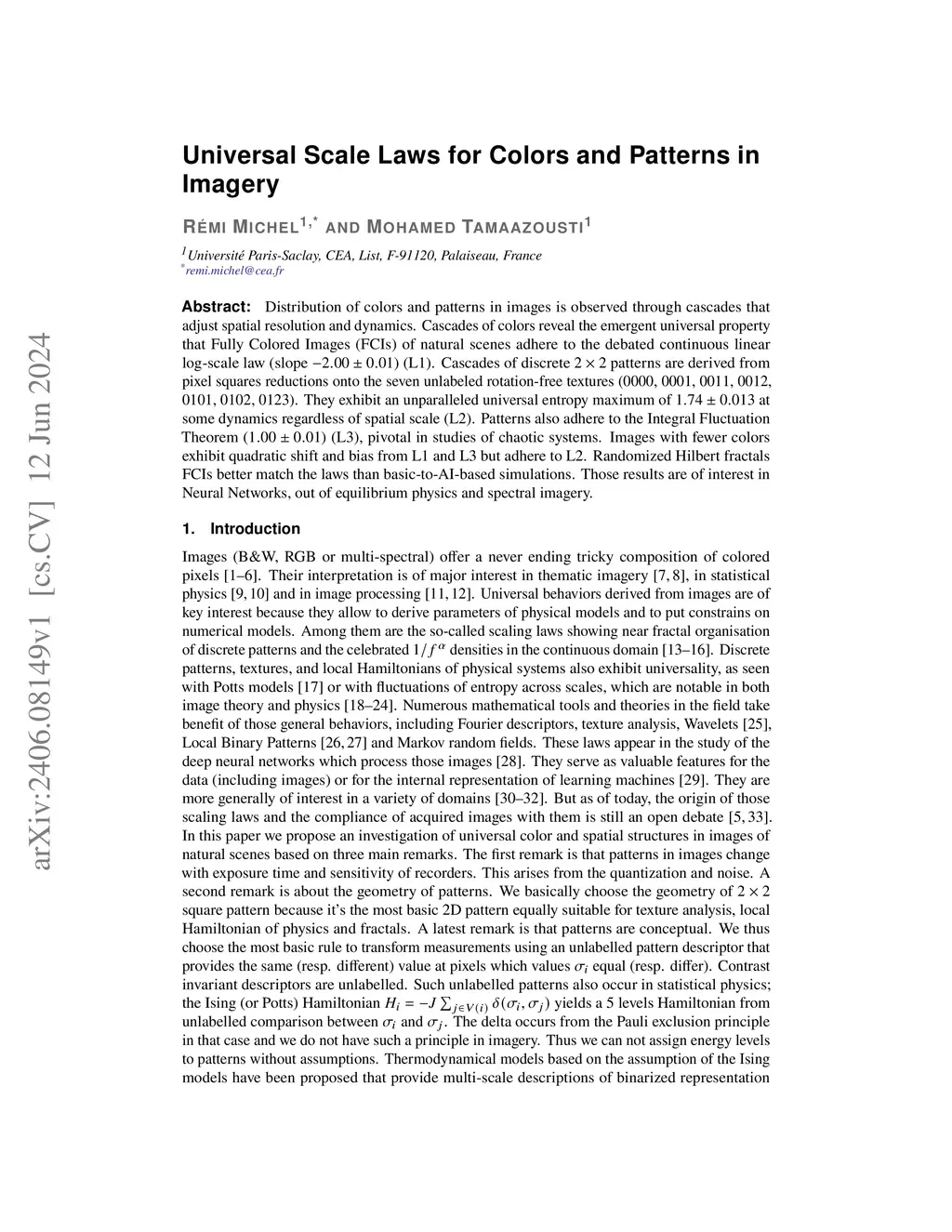 Distribution of colors and patterns in images is observed through cascades that adjust spatial resolution and dynamics. Cascades of colors reveal the emergent universal property that Fully Colored Images (FCIs) of natural scenes adhere to the debated continuous linear log-scale law (slope ) (L1). Cascades of discrete patterns are derived from pixel squares reductions onto the seven unlabeled rotation-free textures (0000, 0001, 0011, 0012, 0101, 0102, 0123). They exhibit an unparalleled universal entropy maximum of at some dynamics regardless of spatial scale (L2). Patterns also adhere to the Integral Fluctuation Theorem () (L3), pivotal in studies of chaotic systems. Images with fewer colors exhibit quadratic shift and bias from L1 and L3 but adhere to L2. Randomized Hilbert fractals FCIs better match the laws than basic-to-AI-based simulations. Those results are of interest in Neural Networks, out of equilibrium physics and spectral imagery.