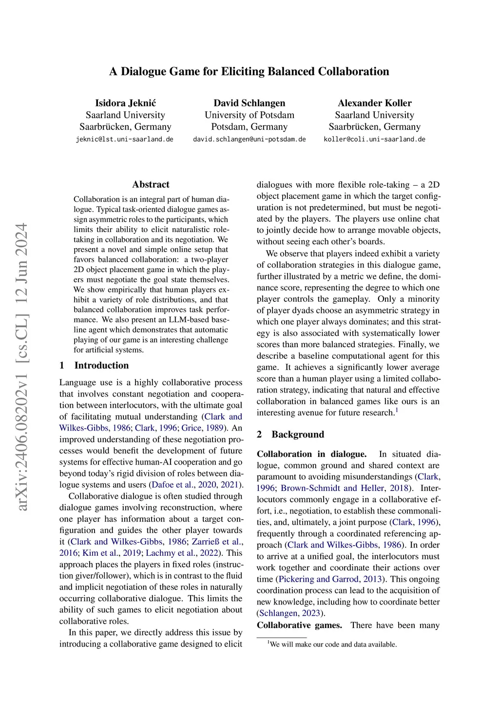 Collaboration is an integral part of human dialogue. Typical task-oriented dialogue games assign asymmetric roles to the participants, which limits their ability to elicit naturalistic role-taking in collaboration and its negotiation. We present a novel and simple online setup that favors balanced collaboration: a two-player 2D object placement game in which the players must negotiate the goal state themselves. We show empirically that human players exhibit a variety of role distributions, and that balanced collaboration improves task performance. We also present an LLM-based baseline agent which demonstrates that automatic playing of our game is an interesting challenge for artificial systems.