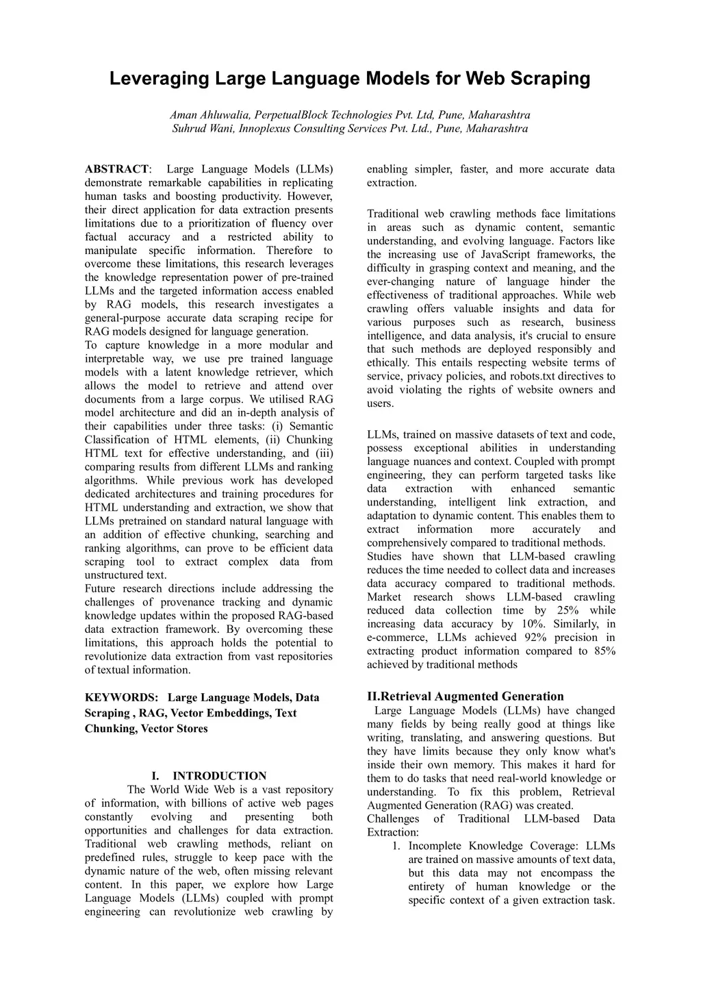 Large Language Models (LLMs) demonstrate remarkable capabilities in replicating human tasks and boosting productivity. However, their direct application for data extraction presents limitations due to a prioritisation of fluency over factual accuracy and a restricted ability to manipulate specific information. Therefore to overcome these limitations, this research leverages the knowledge representation power of pre-trained LLMs and the targeted information access enabled by RAG models, this research investigates a general-purpose accurate data scraping recipe for RAG models designed for language generation. To capture knowledge in a more modular and interpretable way, we use pre trained language models with a latent knowledge retriever, which allows the model to retrieve and attend over documents from a large corpus. We utilised RAG model architecture and did an in-depth analysis of their capabilities under three tasks: (i) Semantic Classification of HTML elements, (ii) Chunking HTML text for effective understanding, and (iii) comparing results from different LLMs and ranking algorithms. While previous work has developed dedicated architectures and training procedures for HTML understanding and extraction, we show that LLMs pre-trained on standard natural language with an addition of effective chunking, searching and ranking algorithms, can prove to be efficient data scraping tool to extract complex data from unstructured text. Future research directions include addressing the challenges of provenance tracking and dynamic knowledge updates within the proposed RAG-based data extraction framework. By overcoming these limitations, this approach holds the potential to revolutionise data extraction from vast repositories of textual information.