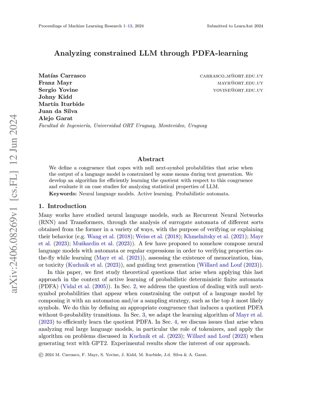 We define a congruence that copes with null next-symbol probabilities that arise when the output of a language model is constrained by some means during text generation. We develop an algorithm for efficiently learning the quotient with respect to this congruence and evaluate it on case studies for analyzing statistical properties of LLM.