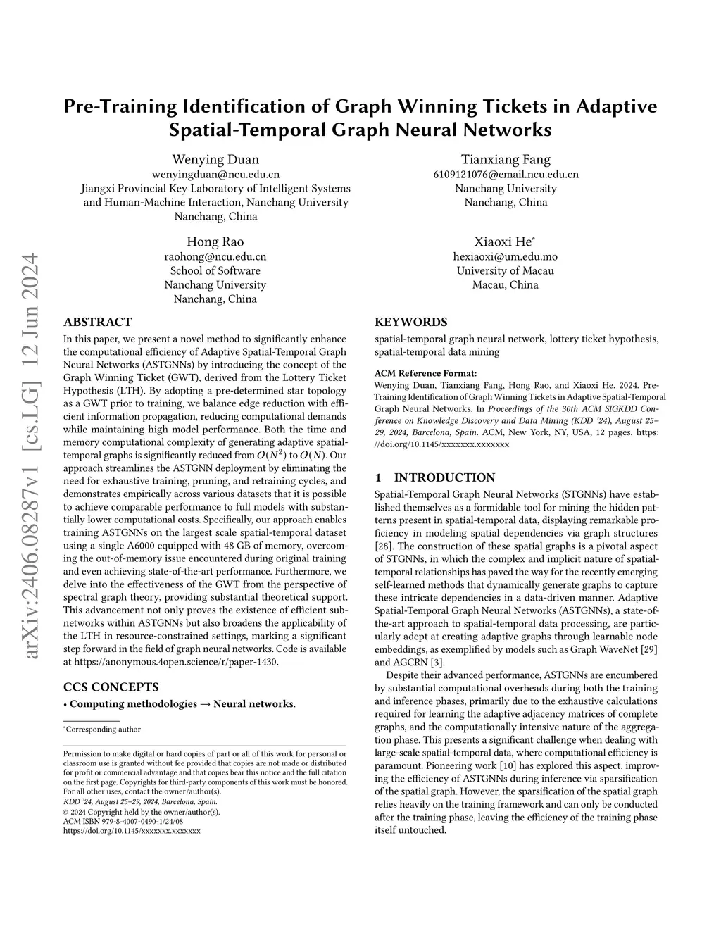 In this paper, we present a novel method to significantly enhance the computational efficiency of Adaptive Spatial-Temporal Graph Neural Networks (ASTGNNs) by introducing the concept of the Graph Winning Ticket (GWT), derived from the Lottery Ticket Hypothesis (LTH). By adopting a pre-determined star topology as a GWT prior to training, we balance edge reduction with efficient information propagation, reducing computational demands while maintaining high model performance. Both the time and memory computational complexity of generating adaptive spatial-temporal graphs is significantly reduced from to . Our approach streamlines the ASTGNN deployment by eliminating the need for exhaustive training, pruning, and retraining cycles, and demonstrates empirically across various datasets that it is possible to achieve comparable performance to full models with substantially lower computational costs. Specifically, our approach enables training ASTGNNs on the largest scale spatial-temporal dataset using a single A6000 equipped with 48 GB of memory, overcoming the out-of-memory issue encountered during original training and even achieving state-of-the-art performance. Furthermore, we delve into the effectiveness of the GWT from the perspective of spectral graph theory, providing substantial theoretical support. This advancement not only proves the existence of efficient sub-networks within ASTGNNs but also broadens the applicability of the LTH in resource-constrained settings, marking a significant step forward in the field of graph neural networks. Code is available at https://anonymous.4open.science/r/paper-1430.