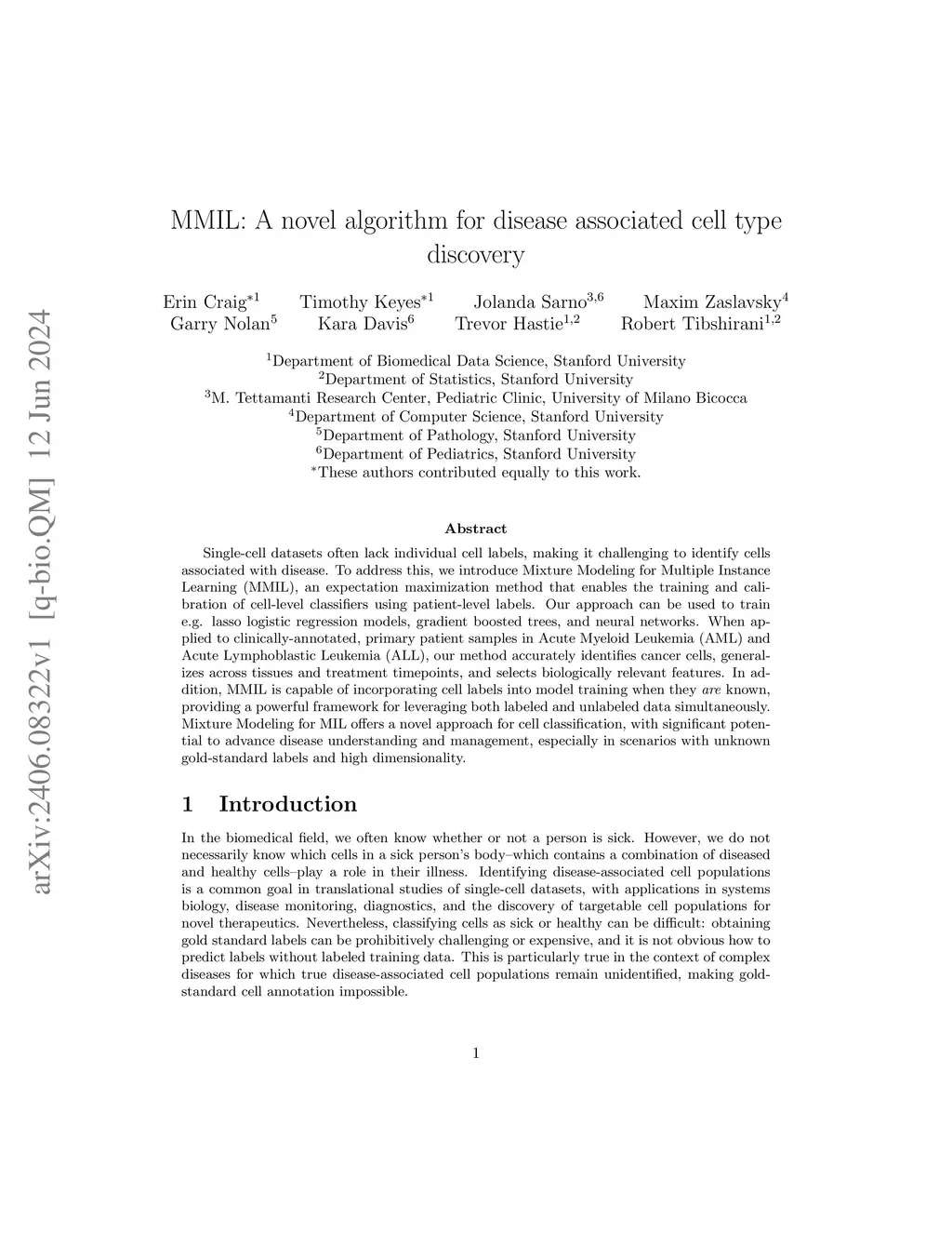 Single-cell datasets often lack individual cell labels, making it challenging to identify cells associated with disease. To address this, we introduce Mixture Modeling for Multiple Instance Learning (MMIL), an expectation maximization method that enables the training and calibration of cell-level classifiers using patient-level labels. Our approach can be used to train e.g. lasso logistic regression models, gradient boosted trees, and neural networks. When applied to clinically-annotated, primary patient samples in Acute Myeloid Leukemia (AML) and Acute Lymphoblastic Leukemia (ALL), our method accurately identifies cancer cells, generalizes across tissues and treatment timepoints, and selects biologically relevant features. In addition, MMIL is capable of incorporating cell labels into model training when they are known, providing a powerful framework for leveraging both labeled and unlabeled data simultaneously. Mixture Modeling for MIL offers a novel approach for cell classification, with significant potential to advance disease understanding and management, especially in scenarios with unknown gold-standard labels and high dimensionality.