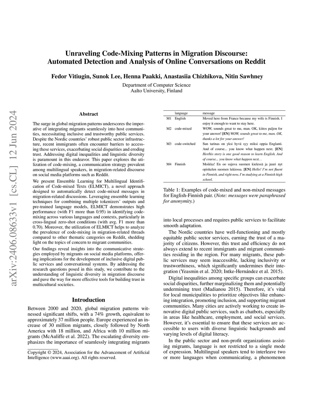 The surge in global migration patterns underscores the imperative of integrating migrants seamlessly into host communities, necessitating inclusive and trustworthy public services. Despite the Nordic countries' robust public sector infrastructure, recent immigrants often encounter barriers to accessing these services, exacerbating social disparities and eroding trust. Addressing digital inequalities and linguistic diversity is paramount in this endeavor. This paper explores the utilization of code-mixing, a communication strategy prevalent among multilingual speakers, in migration-related discourse on social media platforms such as Reddit. We present Ensemble Learning for Multilingual Identification of Code-mixed Texts (ELMICT), a novel approach designed to automatically detect code-mixed messages in migration-related discussions. Leveraging ensemble learning techniques for combining multiple tokenizers' outputs and pre-trained language models, ELMICT demonstrates high performance (with F1 more than 0.95) in identifying code-mixing across various languages and contexts, particularly in cross-lingual zero-shot conditions (with avg. F1 more than 0.70). Moreover, the utilization of ELMICT helps to analyze the prevalence of code-mixing in migration-related threads compared to other thematic categories on Reddit, shedding light on the topics of concern to migrant communities. Our findings reveal insights into the communicative strategies employed by migrants on social media platforms, offering implications for the development of inclusive digital public services and conversational systems. By addressing the research questions posed in this study, we contribute to the understanding of linguistic diversity in migration discourse and pave the way for more effective tools for building trust in multicultural societies.