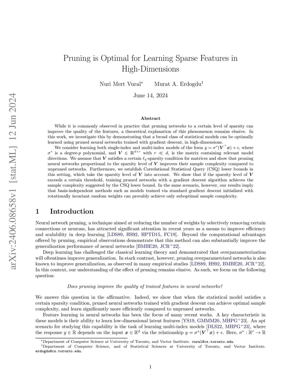 While it is commonly observed in practice that pruning networks to a certain level of sparsity can improve the quality of the features, a theoretical explanation of this phenomenon remains elusive. In this work, we investigate this by demonstrating that a broad class of statistical models can be optimally learned using pruned neural networks trained with gradient descent, in high-dimensions. We consider learning both single-index and multi-index models of the form , where is a degree- polynomial, and with , is the matrix containing relevant model directions. We assume that satisfies a certain -sparsity condition for matrices and show that pruning neural networks proportional to the sparsity level of improves their sample complexity compared to unpruned networks. Furthermore, we establish Correlational Statistical Query (CSQ) lower bounds in this setting, which take the sparsity level of into account. We show that if the sparsity level of exceeds a certain threshold, training pruned networks with a gradient descent algorithm achieves the sample complexity suggested by the CSQ lower bound. In the same scenario, however, our results imply that basis-independent methods such as models trained via standard gradient descent initialized with rotationally invariant random weights can provably achieve only suboptimal sample complexity.