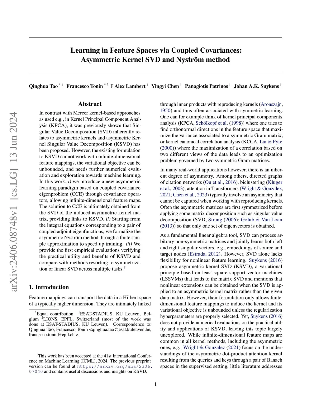 Learning in Feature Spaces via Coupled Covariances: Asymmetric Kernel SVD and Nyström method