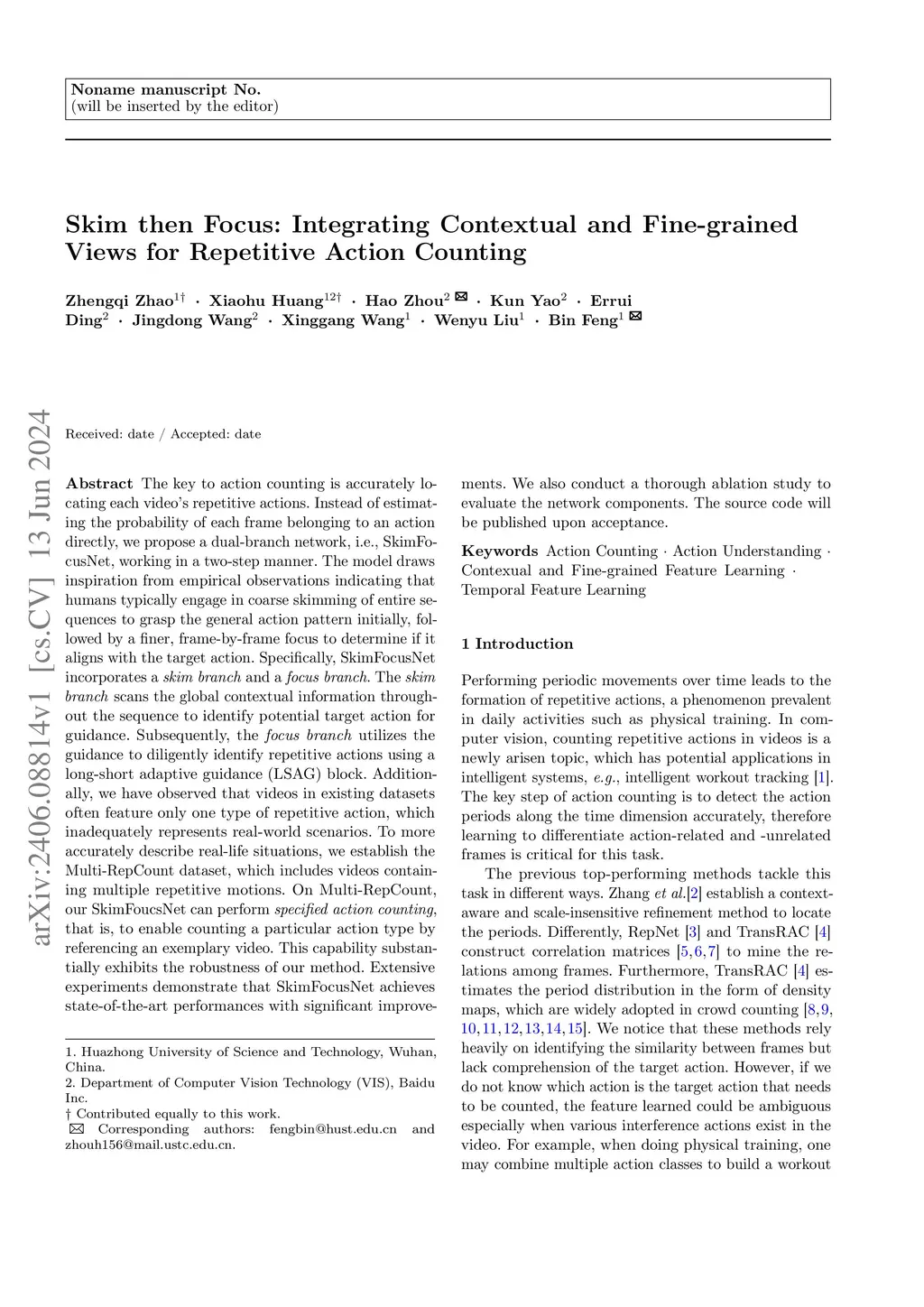The key to action counting is accurately locating each video's repetitive actions. Instead of estimating the probability of each frame belonging to an action directly, we propose a dual-branch network, i.e., SkimFocusNet, working in a two-step manner. The model draws inspiration from empirical observations indicating that humans typically engage in coarse skimming of entire sequences to grasp the general action pattern initially, followed by a finer, frame-by-frame focus to determine if it aligns with the target action. Specifically, SkimFocusNet incorporates a skim branch and a focus branch. The skim branch scans the global contextual information throughout the sequence to identify potential target action for guidance. Subsequently, the focus branch utilizes the guidance to diligently identify repetitive actions using a long-short adaptive guidance (LSAG) block. Additionally, we have observed that videos in existing datasets often feature only one type of repetitive action, which inadequately represents real-world scenarios. To more accurately describe real-life situations, we establish the Multi-RepCount dataset, which includes videos containing multiple repetitive motions. On Multi-RepCount, our SkimFoucsNet can perform specified action counting, that is, to enable counting a particular action type by referencing an exemplary video. This capability substantially exhibits the robustness of our method. Extensive experiments demonstrate that SkimFocusNet achieves state-of-the-art performances with significant improvements. We also conduct a thorough ablation study to evaluate the network components. The source code will be published upon acceptance.