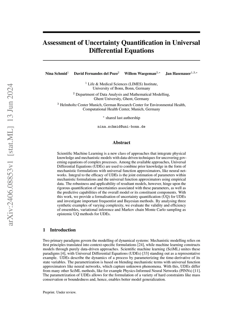 Scientific Machine Learning is a new class of approaches that integrate physical knowledge and mechanistic models with data-driven techniques for uncovering governing equations of complex processes. Among the available approaches, Universal Differential Equations (UDEs) are used to combine prior knowledge in the form of mechanistic formulations with universal function approximators, like neural networks. Integral to the efficacy of UDEs is the joint estimation of parameters within mechanistic formulations and the universal function approximators using empirical data. The robustness and applicability of resultant models, however, hinge upon the rigorous quantification of uncertainties associated with these parameters, as well as the predictive capabilities of the overall model or its constituent components. With this work, we provide a formalisation of uncertainty quantification (UQ) for UDEs and investigate important frequentist and Bayesian methods. By analysing three synthetic examples of varying complexity, we evaluate the validity and efficiency of ensembles, variational inference and Markov chain Monte Carlo sampling as epistemic UQ methods for UDEs.
