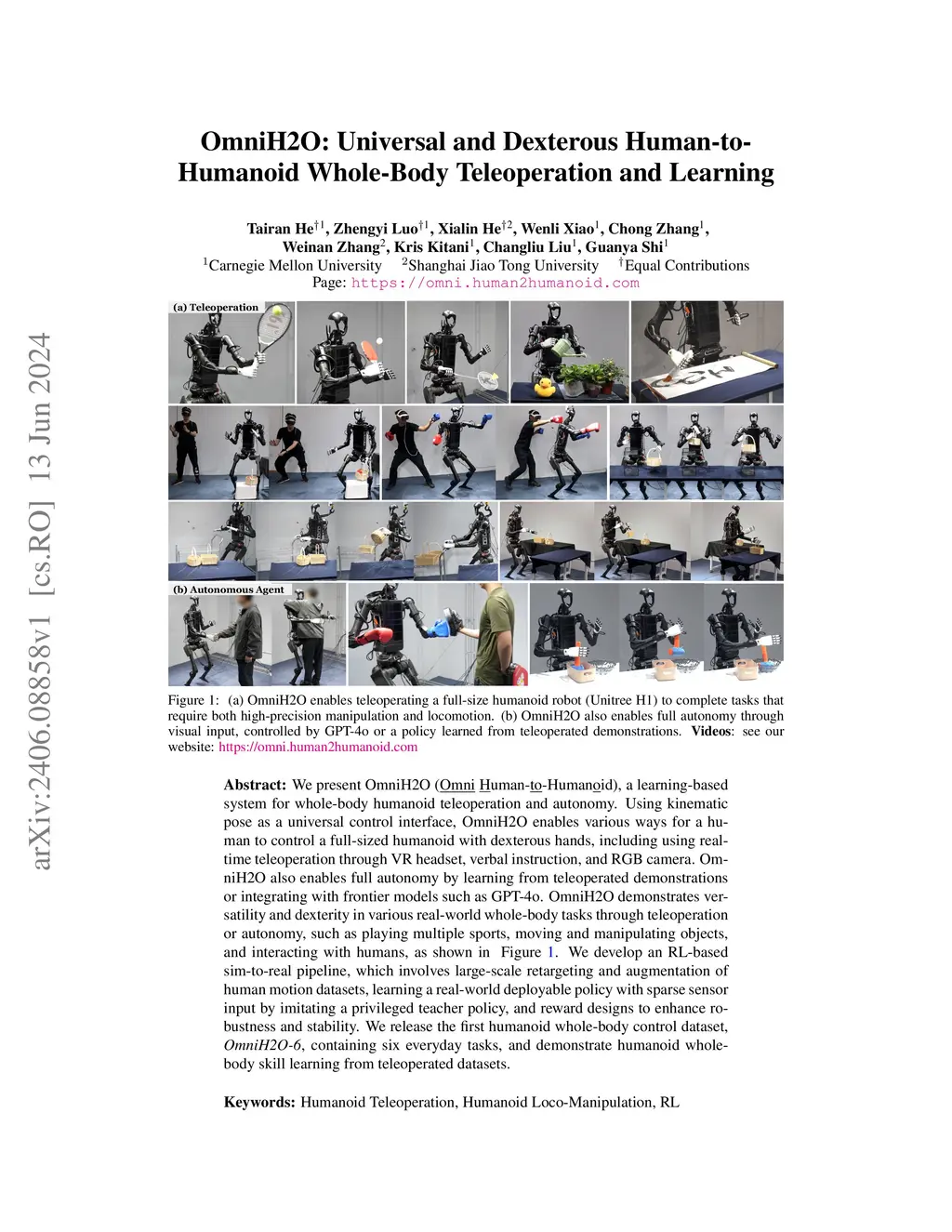 We present OmniH2O (Omni Human-to-Humanoid), a learning-based system for whole-body humanoid teleoperation and autonomy. Using kinematic pose as a universal control interface, OmniH2O enables various ways for a human to control a full-sized humanoid with dexterous hands, including using real-time teleoperation through VR headset, verbal instruction, and RGB camera. OmniH2O also enables full autonomy by learning from teleoperated demonstrations or integrating with frontier models such as GPT-4. OmniH2O demonstrates versatility and dexterity in various real-world whole-body tasks through teleoperation or autonomy, such as playing multiple sports, moving and manipulating objects, and interacting with humans. We develop an RL-based sim-to-real pipeline, which involves large-scale retargeting and augmentation of human motion datasets, learning a real-world deployable policy with sparse sensor input by imitating a privileged teacher policy, and reward designs to enhance robustness and stability. We release the first humanoid whole-body control dataset, OmniH2O-6, containing six everyday tasks, and demonstrate humanoid whole-body skill learning from teleoperated datasets.