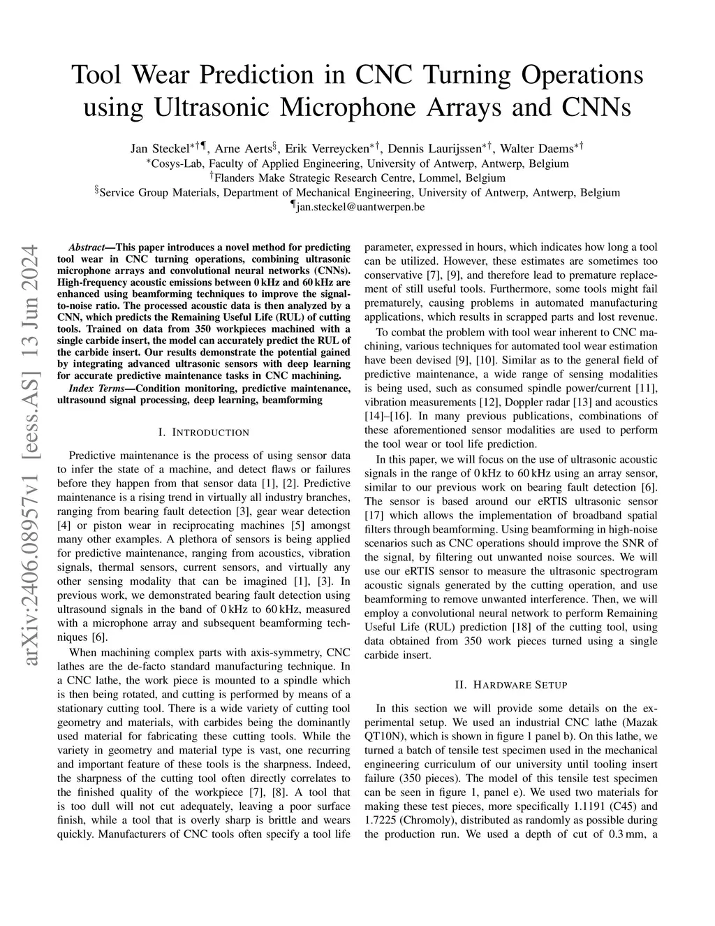 This paper introduces a novel method for predicting tool wear in CNC turning operations, combining ultrasonic microphone arrays and convolutional neural networks (CNNs). High-frequency acoustic emissions between 0 kHz and 60 kHz are enhanced using beamforming techniques to improve the signal- to-noise ratio. The processed acoustic data is then analyzed by a CNN, which predicts the Remaining Useful Life (RUL) of cutting tools. Trained on data from 350 workpieces machined with a single carbide insert, the model can accurately predict the RUL of the carbide insert. Our results demonstrate the potential gained by integrating advanced ultrasonic sensors with deep learning for accurate predictive maintenance tasks in CNC machining.