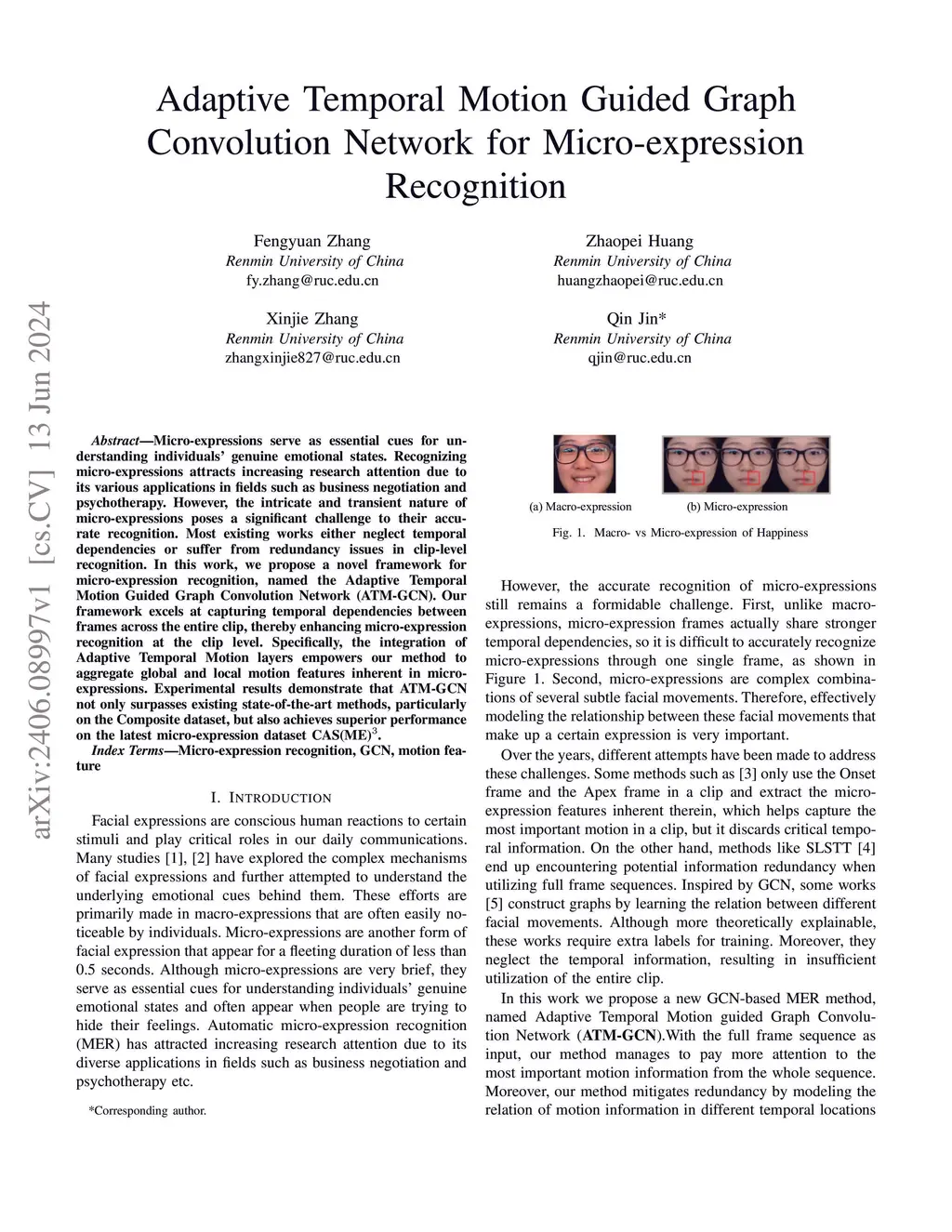 Micro-expressions serve as essential cues for understanding individuals' genuine emotional states. Recognizing micro-expressions attracts increasing research attention due to its various applications in fields such as business negotiation and psychotherapy. However, the intricate and transient nature of micro-expressions poses a significant challenge to their accurate recognition. Most existing works either neglect temporal dependencies or suffer from redundancy issues in clip-level recognition. In this work, we propose a novel framework for micro-expression recognition, named the Adaptive Temporal Motion Guided Graph Convolution Network (ATM-GCN). Our framework excels at capturing temporal dependencies between frames across the entire clip, thereby enhancing micro-expression recognition at the clip level. Specifically, the integration of Adaptive Temporal Motion layers empowers our method to aggregate global and local motion features inherent in micro-expressions. Experimental results demonstrate that ATM-GCN not only surpasses existing state-of-the-art methods, particularly on the Composite dataset, but also achieves superior performance on the latest micro-expression dataset CAS(ME).