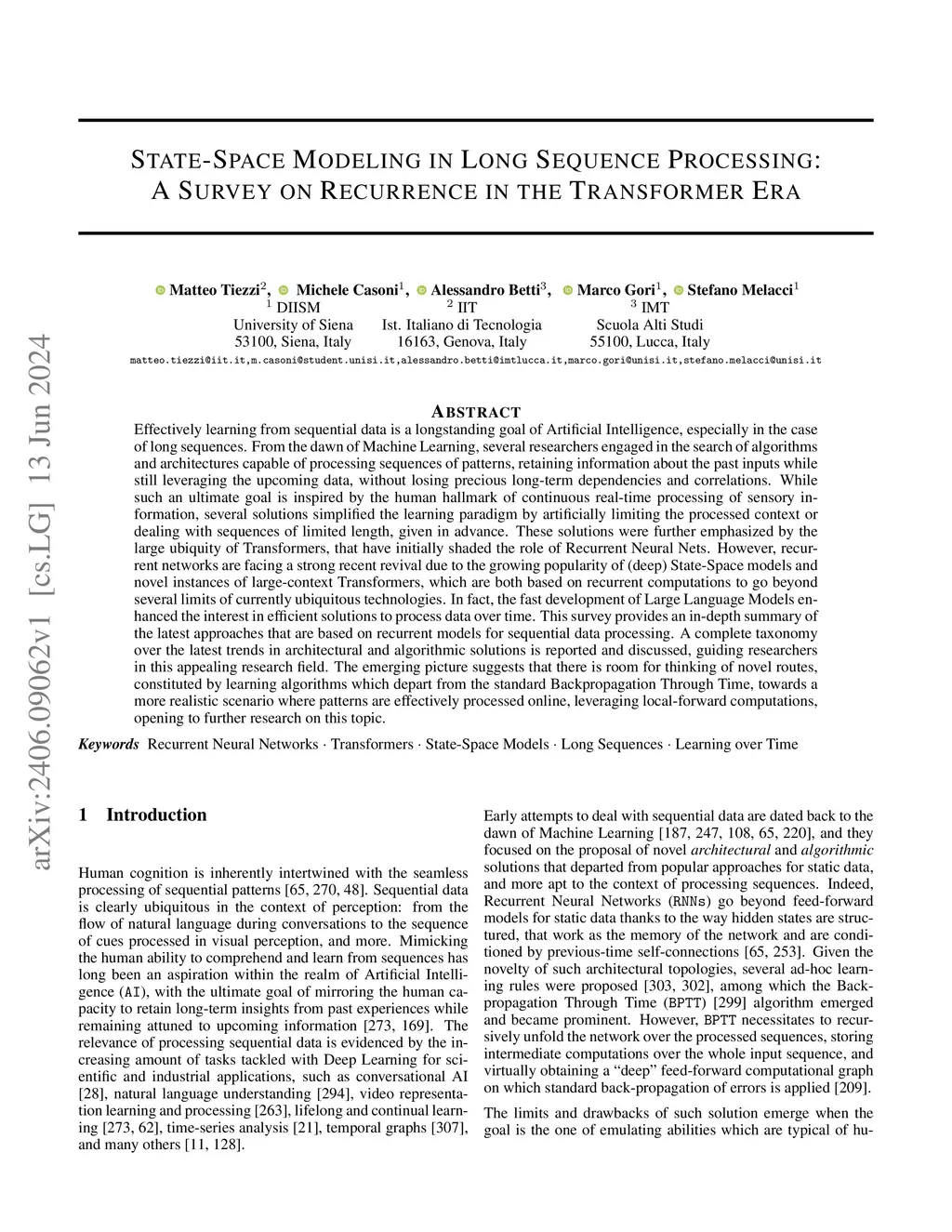 Effectively learning from sequential data is a longstanding goal of Artificial Intelligence, especially in the case of long sequences. From the dawn of Machine Learning, several researchers have pursued algorithms and architectures capable of processing sequences of patterns, retaining information about past inputs while still leveraging future data, without losing precious long-term dependencies and correlations. While such an ultimate goal is inspired by the human hallmark of continuous real-time processing of sensory information, several solutions have simplified the learning paradigm by artificially limiting the processed context or dealing with sequences of limited length, given in advance. These solutions were further emphasized by the ubiquity of Transformers, which initially overshadowed the role of Recurrent Neural Nets. However, recurrent networks are currently experiencing a strong recent revival due to the growing popularity of (deep) State-Space models and novel instances of large-context Transformers, which are both based on recurrent computations that aim to go beyond several limits of currently ubiquitous technologies. The fast development of Large Language Models has renewed the interest in efficient solutions to process data over time. This survey provides an in-depth summary of the latest approaches that are based on recurrent models for sequential data processing. A complete taxonomy of recent trends in architectural and algorithmic solutions is reported and discussed, guiding researchers in this appealing research field. The emerging picture suggests that there is room for exploring novel routes, constituted by learning algorithms that depart from the standard Backpropagation Through Time, towards a more realistic scenario where patterns are effectively processed online, leveraging local-forward computations, and opening new directions for research on this topic.
