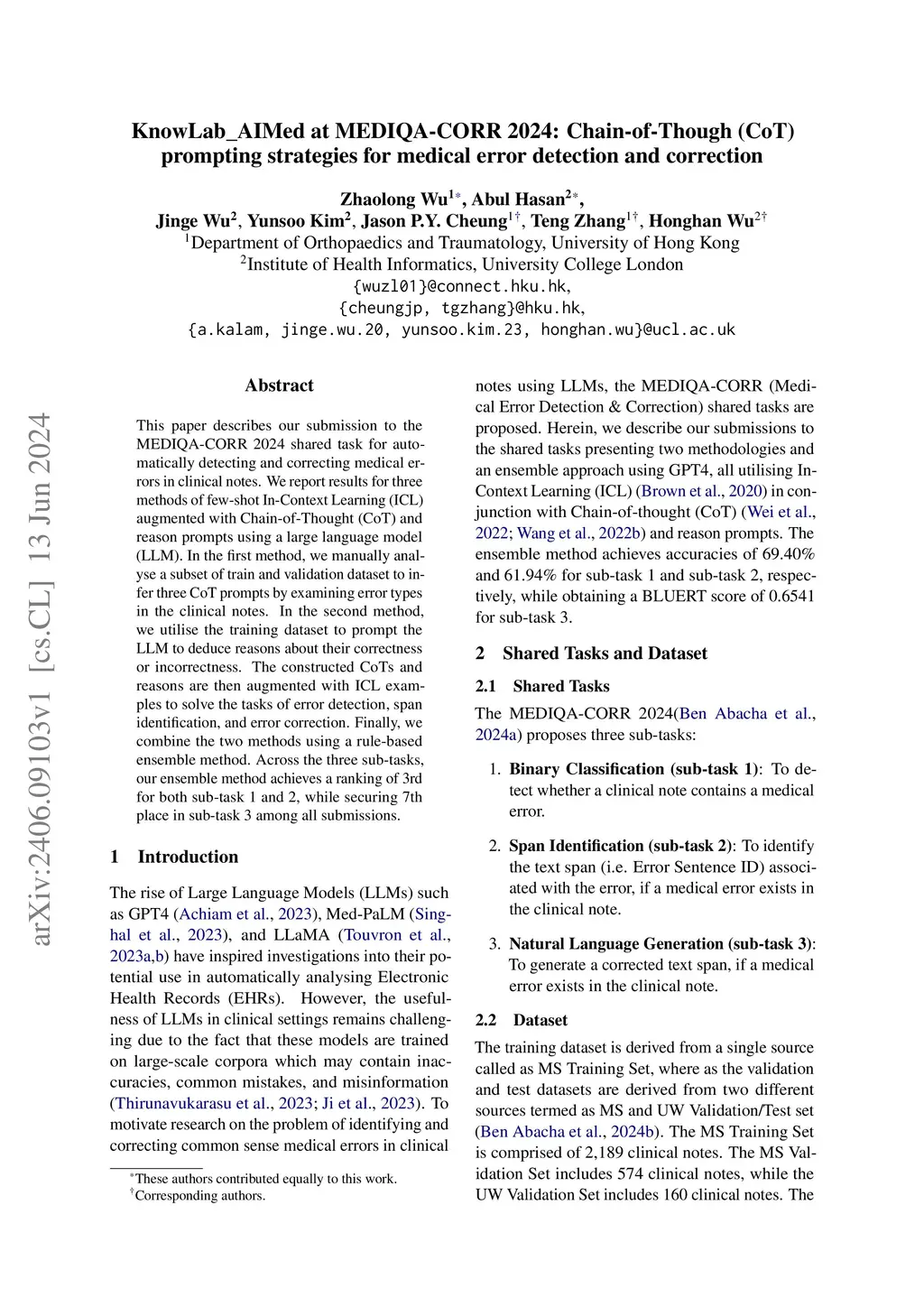 This paper describes our submission to the MEDIQA-CORR 2024 shared task for automatically detecting and correcting medical errors in clinical notes. We report results for three methods of few-shot In-Context Learning (ICL) augmented with Chain-of-Thought (CoT) and reason prompts using a large language model (LLM). In the first method, we manually analyse a subset of train and validation dataset to infer three CoT prompts by examining error types in the clinical notes. In the second method, we utilise the training dataset to prompt the LLM to deduce reasons about their correctness or incorrectness. The constructed CoTs and reasons are then augmented with ICL examples to solve the tasks of error detection, span identification, and error correction. Finally, we combine the two methods using a rule-based ensemble method. Across the three sub-tasks, our ensemble method achieves a ranking of 3rd for both sub-task 1 and 2, while securing 7th place in sub-task 3 among all submissions.