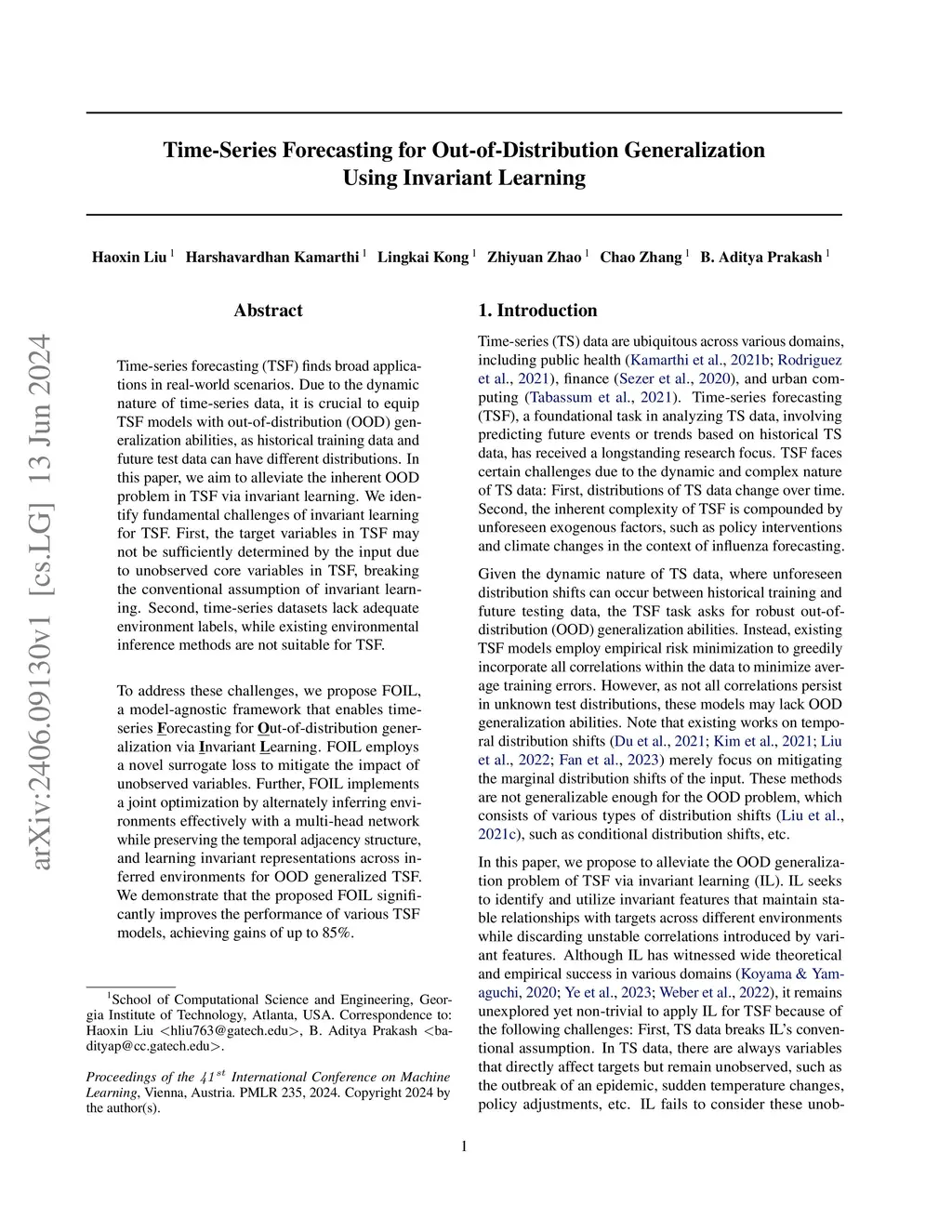 Time-series forecasting (TSF) finds broad applications in real-world scenarios. Due to the dynamic nature of time-series data, it is crucial to equip TSF models with out-of-distribution (OOD) generalization abilities, as historical training data and future test data can have different distributions. In this paper, we aim to alleviate the inherent OOD problem in TSF via invariant learning. We identify fundamental challenges of invariant learning for TSF. First, the target variables in TSF may not be sufficiently determined by the input due to unobserved core variables in TSF, breaking the conventional assumption of invariant learning. Second, time-series datasets lack adequate environment labels, while existing environmental inference methods are not suitable for TSF. To address these challenges, we propose FOIL, a model-agnostic framework that enables timeseries Forecasting for Out-of-distribution generalization via Invariant Learning. FOIL employs a novel surrogate loss to mitigate the impact of unobserved variables. Further, FOIL implements a joint optimization by alternately inferring environments effectively with a multi-head network while preserving the temporal adjacency structure, and learning invariant representations across inferred environments for OOD generalized TSF. We demonstrate that the proposed FOIL significantly improves the performance of various TSF models, achieving gains of up to 85%.