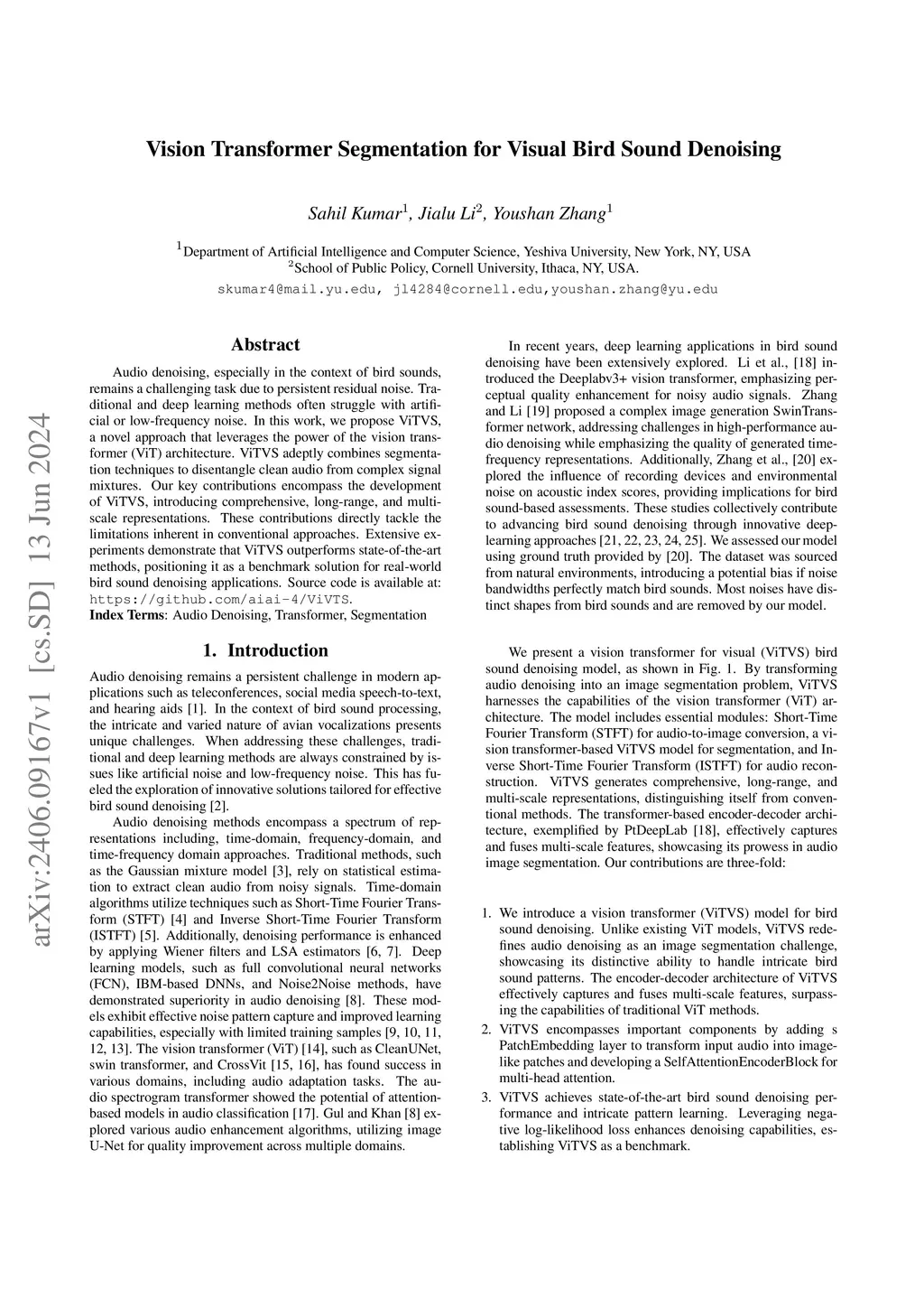 Audio denoising, especially in the context of bird sounds, remains a challenging task due to persistent residual noise. Traditional and deep learning methods often struggle with artificial or low-frequency noise. In this work, we propose ViTVS, a novel approach that leverages the power of the vision transformer (ViT) architecture. ViTVS adeptly combines segmentation techniques to disentangle clean audio from complex signal mixtures. Our key contributions encompass the development of ViTVS, introducing comprehensive, long-range, and multi-scale representations. These contributions directly tackle the limitations inherent in conventional approaches. Extensive experiments demonstrate that ViTVS outperforms state-of-the-art methods, positioning it as a benchmark solution for real-world bird sound denoising applications. Source code is available at: https://github.com/aiai-4/ViVTS.