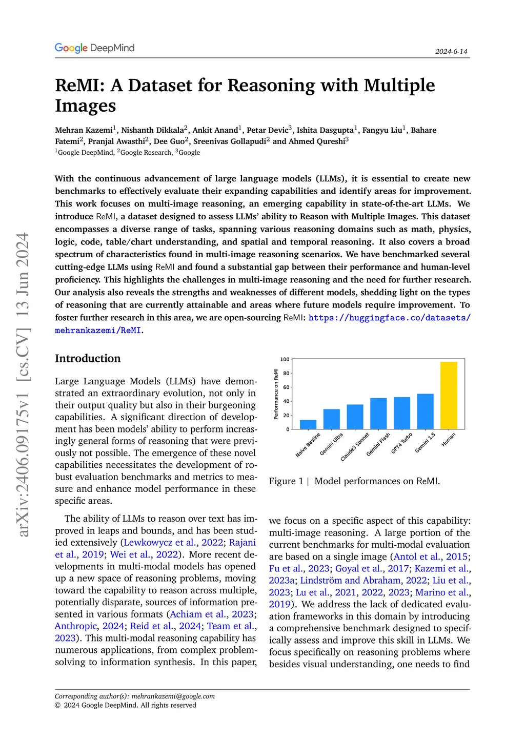 With the continuous advancement of large language models (LLMs), it is essential to create new benchmarks to effectively evaluate their expanding capabilities and identify areas for improvement. This work focuses on multi-image reasoning, an emerging capability in state-of-the-art LLMs. We introduce ReMI, a dataset designed to assess LLMs' ability to Reason with Multiple Images. This dataset encompasses a diverse range of tasks, spanning various reasoning domains such as math, physics, logic, code, table/chart understanding, and spatial and temporal reasoning. It also covers a broad spectrum of characteristics found in multi-image reasoning scenarios. We have benchmarked several cutting-edge LLMs using ReMI and found a substantial gap between their performance and human-level proficiency. This highlights the challenges in multi-image reasoning and the need for further research. Our analysis also reveals the strengths and weaknesses of different models, shedding light on the types of reasoning that are currently attainable and areas where future models require improvement. To foster further research in this area, we are releasing ReMI publicly: https://huggingface.co/datasets/mehrankazemi/ReMI.