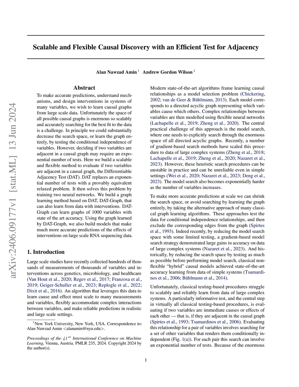 To make accurate predictions, understand mechanisms, and design interventions in systems of many variables, we wish to learn causal graphs from large scale data. Unfortunately the space of all possible causal graphs is enormous so scalably and accurately searching for the best fit to the data is a challenge. In principle we could substantially decrease the search space, or learn the graph entirely, by testing the conditional independence of variables. However, deciding if two variables are adjacent in a causal graph may require an exponential number of tests. Here we build a scalable and flexible method to evaluate if two variables are adjacent in a causal graph, the Differentiable Adjacency Test (DAT). DAT replaces an exponential number of tests with a provably equivalent relaxed problem. It then solves this problem by training two neural networks. We build a graph learning method based on DAT, DAT-Graph, that can also learn from data with interventions. DAT-Graph can learn graphs of 1000 variables with state of the art accuracy. Using the graph learned by DAT-Graph, we also build models that make much more accurate predictions of the effects of interventions on large scale RNA sequencing data.