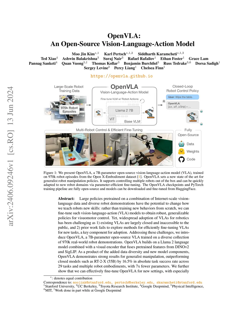 Large policies pretrained on a combination of Internet-scale vision-language data and diverse robot demonstrations have the potential to change how we teach robots new skills: rather than training new behaviors from scratch, we can fine-tune such vision-language-action (VLA) models to obtain robust, generalizable policies for visuomotor control. Yet, widespread adoption of VLAs for robotics has been challenging as 1) existing VLAs are largely closed and inaccessible to the public, and 2) prior work fails to explore methods for efficiently fine-tuning VLAs for new tasks, a key component for adoption. Addressing these challenges, we introduce OpenVLA, a 7B-parameter open-source VLA trained on a diverse collection of 970k real-world robot demonstrations. OpenVLA builds on a Llama 2 language model combined with a visual encoder that fuses pretrained features from DINOv2 and SigLIP. As a product of the added data diversity and new model components, OpenVLA demonstrates strong results for generalist manipulation, outperforming closed models such as RT-2-X (55B) by 16.5% in absolute task success rate across 29 tasks and multiple robot embodiments, with 7x fewer parameters. We further show that we can effectively fine-tune OpenVLA for new settings, with especially strong generalization results in multi-task environments involving multiple objects and strong language grounding abilities, and outperform expressive from-scratch imitation learning methods such as Diffusion Policy by 20.4%. We also explore compute efficiency; as a separate contribution, we show that OpenVLA can be fine-tuned on consumer GPUs via modern low-rank adaptation methods and served efficiently via quantization without a hit to downstream success rate. Finally, we release model checkpoints, fine-tuning notebooks, and our PyTorch codebase with built-in support for training VLAs at scale on Open X-Embodiment datasets.
