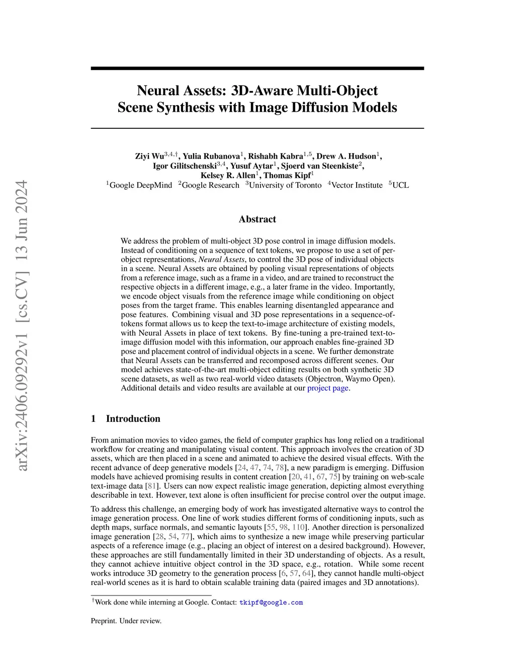 We address the problem of multi-object 3D pose control in image diffusion models. Instead of conditioning on a sequence of text tokens, we propose to use a set of per-object representations, Neural Assets, to control the 3D pose of individual objects in a scene. Neural Assets are obtained by pooling visual representations of objects from a reference image, such as a frame in a video, and are trained to reconstruct the respective objects in a different image, e.g., a later frame in the video. Importantly, we encode object visuals from the reference image while conditioning on object poses from the target frame. This enables learning disentangled appearance and pose features. Combining visual and 3D pose representations in a sequence-of-tokens format allows us to keep the text-to-image architecture of existing models, with Neural Assets in place of text tokens. By fine-tuning a pre-trained text-to-image diffusion model with this information, our approach enables fine-grained 3D pose and placement control of individual objects in a scene. We further demonstrate that Neural Assets can be transferred and recomposed across different scenes. Our model achieves state-of-the-art multi-object editing results on both synthetic 3D scene datasets, as well as two real-world video datasets (Objectron, Waymo Open).