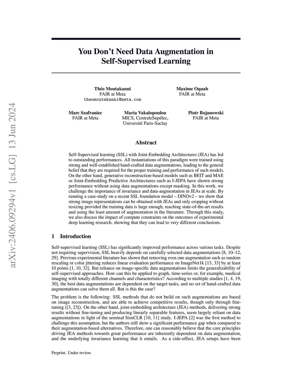 Self-Supervised learning (SSL) with Joint-Embedding Architectures (JEA) has led to outstanding performances. All instantiations of this paradigm were trained using strong and well-established hand-crafted data augmentations, leading to the general belief that they are required for the proper training and performance of such models. On the other hand, generative reconstruction-based models such as BEIT and MAE or Joint-Embedding Predictive Architectures such as I-JEPA have shown strong performance without using data augmentations except masking. In this work, we challenge the importance of invariance and data-augmentation in JEAs at scale. By running a case-study on a recent SSL foundation model - DINOv2 - we show that strong image representations can be obtained with JEAs and only cropping without resizing provided the training data is large enough, reaching state-of-the-art results and using the least amount of augmentation in the literature. Through this study, we also discuss the impact of compute constraints on the outcomes of experimental deep learning research, showing that they can lead to very different conclusions.