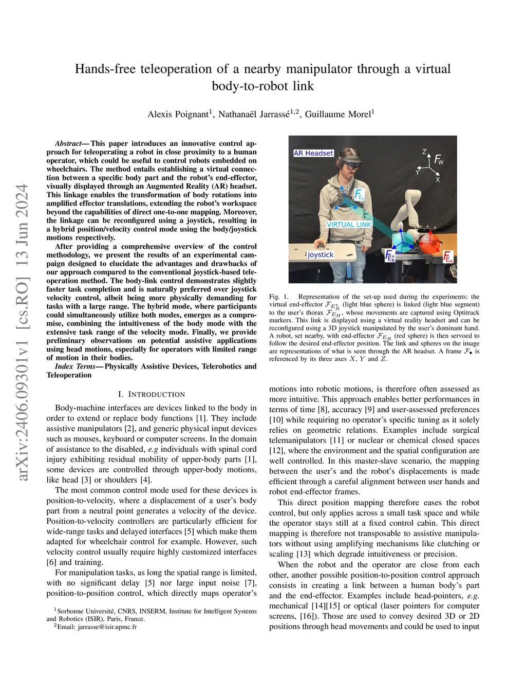 This paper introduces an innovative control approach for teleoperating a robot in close proximity to a human operator, which could be useful to control robots embedded on wheelchairs. The method entails establishing a virtual connection between a specific body part and the robot's end-effector, visually displayed through an Augmented Reality (AR) headset. This linkage enables the transformation of body rotations into amplified effector translations, extending the robot's workspace beyond the capabilities of direct one-to-one mapping. Moreover, the linkage can be reconfigured using a joystick, resulting in a hybrid position/velocity control mode using the body/joystick motions respectively. After providing a comprehensive overview of the control methodology, we present the results of an experimental campaign designed to elucidate the advantages and drawbacks of our approach compared to the conventional joystick-based teleoperation method. The body-link control demonstrates slightly faster task completion and is naturally preferred over joystick velocity control, albeit being more physically demanding for tasks with a large range. The hybrid mode, where participants could simultaneously utilize both modes, emerges as a compromise, combining the intuitiveness of the body mode with the extensive task range of the velocity mode. Finally, we provide preliminary observations on potential assistive applications using head motions, especially for operators with limited range of motion in their bodies.