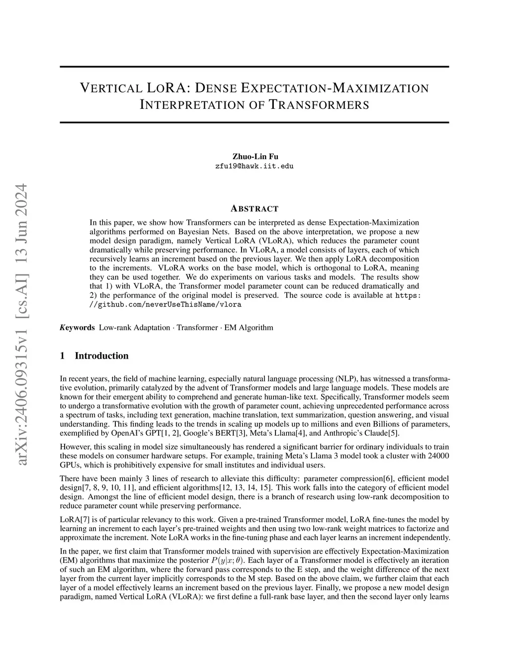 In this paper, we show how Transformers can be interpreted as dense Expectation-Maximization algorithms performed on Bayesian Nets. Based on the above interpretation, we propose a new model design paradigm, namely Vertical LoRA (VLoRA), which reduces the parameter count dramatically while preserving performance. In VLoRA, a model consists of layers, each of which recursively learns an increment based on the previous layer. We then apply LoRA decomposition to the increments. VLoRA works on the base model, which is orthogonal to LoRA, meaning they can be used together. We do experiments on various tasks and models. The results show that 1) with VLoRA, the Transformer model parameter count can be reduced dramatically and 2) the performance of the original model is preserved. The source code is available at \url{https://github.com/neverUseThisName/vlora}