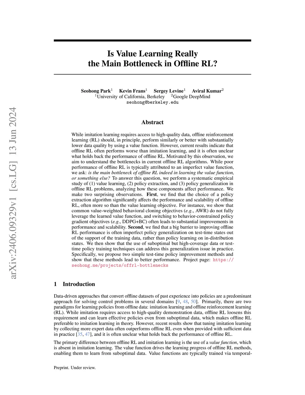 While imitation learning requires access to high-quality data, offline reinforcement learning (RL) should, in principle, perform similarly or better with substantially lower data quality by using a value function. However, current results indicate that offline RL often performs worse than imitation learning, and it is often unclear what holds back the performance of offline RL. Motivated by this observation, we aim to understand the bottlenecks in current offline RL algorithms. While poor performance of offline RL is typically attributed to an imperfect value function, we ask: is the main bottleneck of offline RL indeed in learning the value function, or something else? To answer this question, we perform a systematic empirical study of (1) value learning, (2) policy extraction, and (3) policy generalization in offline RL problems, analyzing how these components affect performance. We make two surprising observations. First, we find that the choice of a policy extraction algorithm significantly affects the performance and scalability of offline RL, often more so than the value learning objective. For instance, we show that common value-weighted behavioral cloning objectives (e.g., AWR) do not fully leverage the learned value function, and switching to behavior-constrained policy gradient objectives (e.g., DDPG+BC) often leads to substantial improvements in performance and scalability. Second, we find that a big barrier to improving offline RL performance is often imperfect policy generalization on test-time states out of the support of the training data, rather than policy learning on in-distribution states. We then show that the use of suboptimal but high-coverage data or test-time policy training techniques can address this generalization issue in practice. Specifically, we propose two simple test-time policy improvement methods and show that these methods lead to better performance.