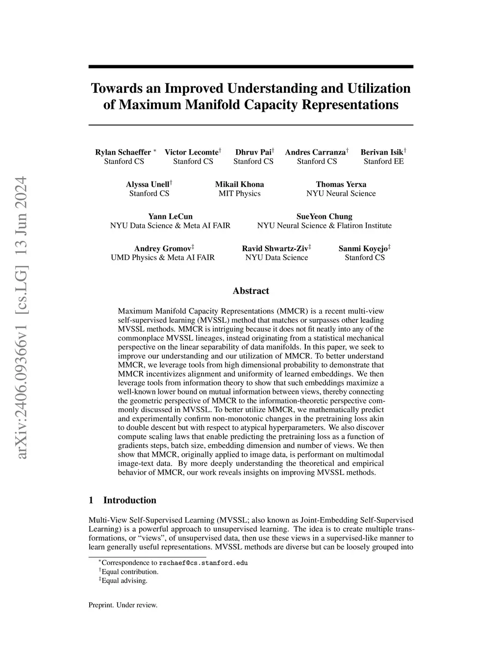 Maximum Manifold Capacity Representations (MMCR) is a recent multi-view self-supervised learning (MVSSL) method that matches or surpasses other leading MVSSL methods. MMCR is intriguing because it does not fit neatly into any of the commonplace MVSSL lineages, instead originating from a statistical mechanical perspective on the linear separability of data manifolds. In this paper, we seek to improve our understanding and our utilization of MMCR. To better understand MMCR, we leverage tools from high dimensional probability to demonstrate that MMCR incentivizes alignment and uniformity of learned embeddings. We then leverage tools from information theory to show that such embeddings maximize a well-known lower bound on mutual information between views, thereby connecting the geometric perspective of MMCR to the information-theoretic perspective commonly discussed in MVSSL. To better utilize MMCR, we mathematically predict and experimentally confirm non-monotonic changes in the pretraining loss akin to double descent but with respect to atypical hyperparameters. We also discover compute scaling laws that enable predicting the pretraining loss as a function of gradients steps, batch size, embedding dimension and number of views. We then show that MMCR, originally applied to image data, is performant on multimodal image-text data. By more deeply understanding the theoretical and empirical behavior of MMCR, our work reveals insights on improving MVSSL methods.