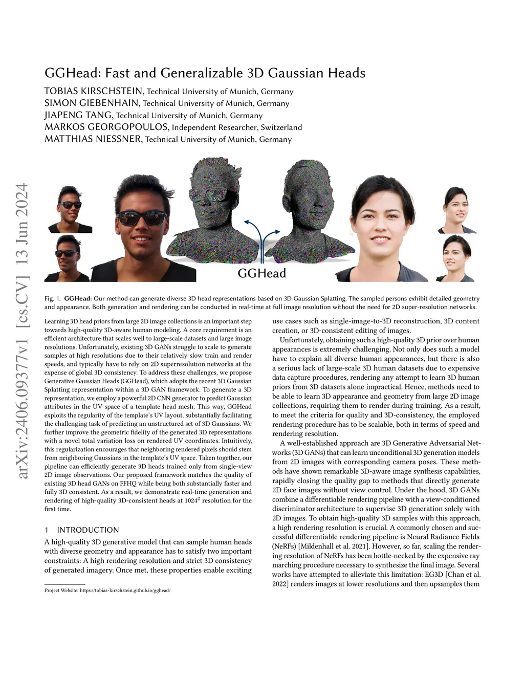 Learning 3D head priors from large 2D image collections is an important step towards high-quality 3D-aware human modeling. A core requirement is an efficient architecture that scales well to large-scale datasets and large image resolutions. Unfortunately, existing 3D GANs struggle to scale to generate samples at high resolutions due to their relatively slow train and render speeds, and typically have to rely on 2D superresolution networks at the expense of global 3D consistency. To address these challenges, we propose Generative Gaussian Heads (GGHead), which adopts the recent 3D Gaussian Splatting representation within a 3D GAN framework. To generate a 3D representation, we employ a powerful 2D CNN generator to predict Gaussian attributes in the UV space of a template head mesh. This way, GGHead exploits the regularity of the template's UV layout, substantially facilitating the challenging task of predicting an unstructured set of 3D Gaussians. We further improve the geometric fidelity of the generated 3D representations with a novel total variation loss on rendered UV coordinates. Intuitively, this regularization encourages that neighboring rendered pixels should stem from neighboring Gaussians in the template's UV space. Taken together, our pipeline can efficiently generate 3D heads trained only from single-view 2D image observations. Our proposed framework matches the quality of existing 3D head GANs on FFHQ while being both substantially faster and fully 3D consistent. As a result, we demonstrate real-time generation and rendering of high-quality 3D-consistent heads at resolution for the first time.