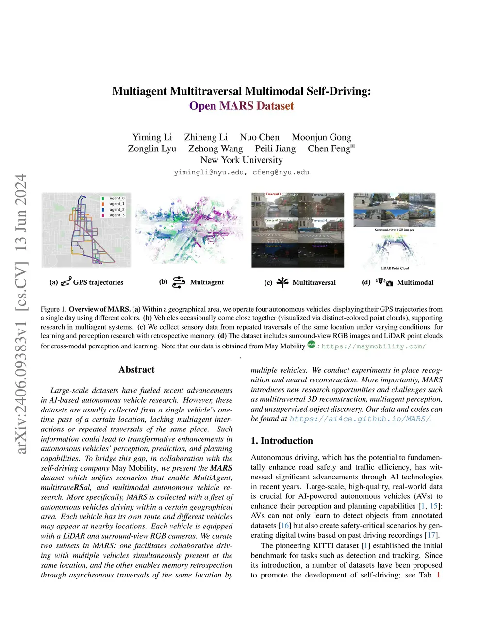 Large-scale datasets have fueled recent advancements in AI-based autonomous vehicle research. However, these datasets are usually collected from a single vehicle's one-time pass of a certain location, lacking multiagent interactions or repeated traversals of the same place. Such information could lead to transformative enhancements in autonomous vehicles' perception, prediction, and planning capabilities. To bridge this gap, in collaboration with the self-driving company May Mobility, we present the MARS dataset which unifies scenarios that enable MultiAgent, multitraveRSal, and multimodal autonomous vehicle research. More specifically, MARS is collected with a fleet of autonomous vehicles driving within a certain geographical area. Each vehicle has its own route and different vehicles may appear at nearby locations. Each vehicle is equipped with a LiDAR and surround-view RGB cameras. We curate two subsets in MARS: one facilitates collaborative driving with multiple vehicles simultaneously present at the same location, and the other enables memory retrospection through asynchronous traversals of the same location by multiple vehicles. We conduct experiments in place recognition and neural reconstruction. More importantly, MARS introduces new research opportunities and challenges such as multitraversal 3D reconstruction, multiagent perception, and unsupervised object discovery. Our data and codes can be found at https://ai4ce.github.io/MARS/.