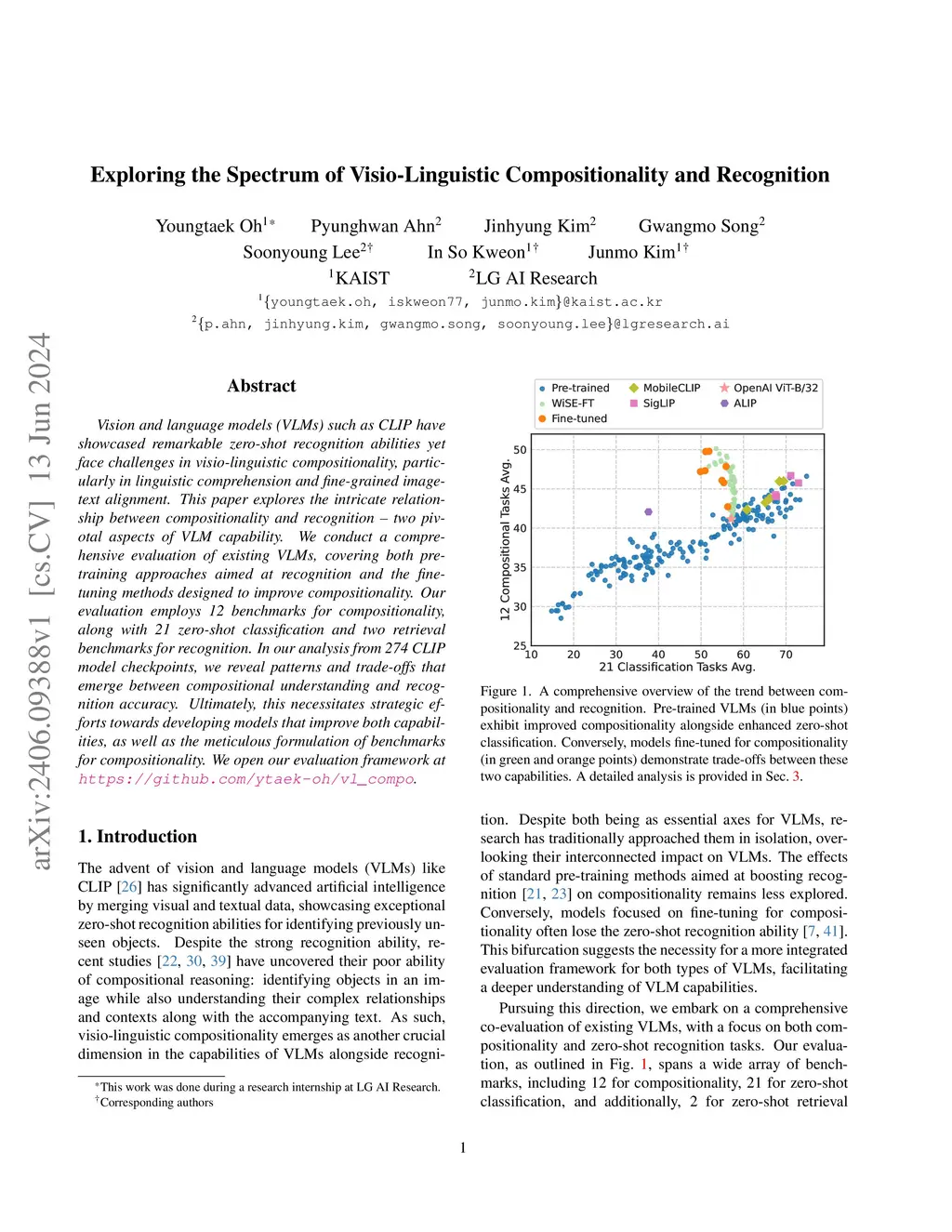Vision and language models (VLMs) such as CLIP have showcased remarkable zero-shot recognition abilities yet face challenges in visio-linguistic compositionality, particularly in linguistic comprehension and fine-grained image-text alignment. This paper explores the intricate relationship between compositionality and recognition -- two pivotal aspects of VLM capability. We conduct a comprehensive evaluation of existing VLMs, covering both pre-training approaches aimed at recognition and the fine-tuning methods designed to improve compositionality. Our evaluation employs 12 benchmarks for compositionality, along with 21 zero-shot classification and two retrieval benchmarks for recognition. In our analysis from 274 CLIP model checkpoints, we reveal patterns and trade-offs that emerge between compositional understanding and recognition accuracy. Ultimately, this necessitates strategic efforts towards developing models that improve both capabilities, as well as the meticulous formulation of benchmarks for compositionality. We open our evaluation framework at https://github.com/ytaek-oh/vl_compo.