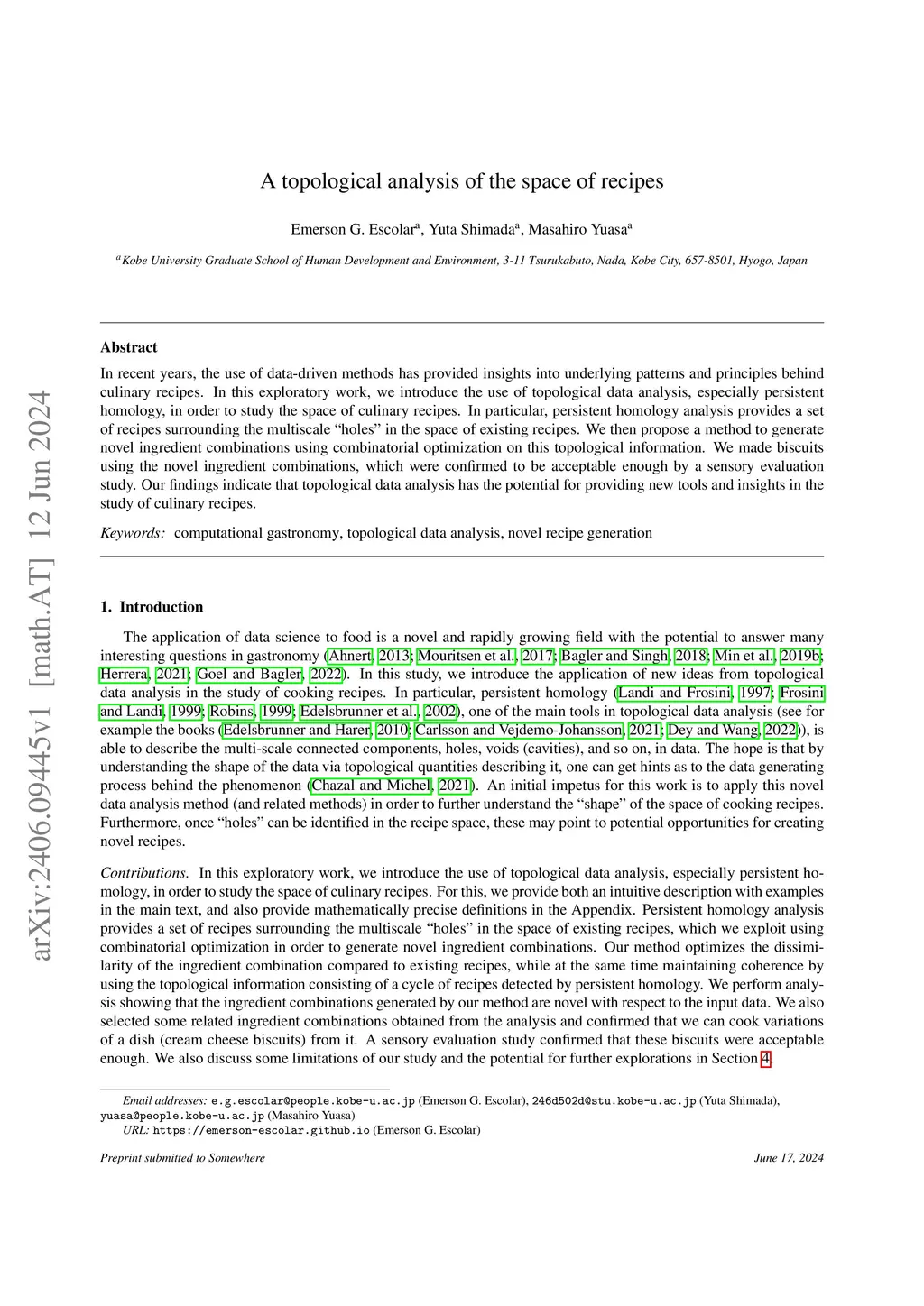 In recent years, the use of data-driven methods has provided insights into underlying patterns and principles behind culinary recipes. In this exploratory work, we introduce the use of topological data analysis, especially persistent homology, in order to study the space of culinary recipes. In particular, persistent homology analysis provides a set of recipes surrounding the multiscale "holes" in the space of existing recipes. We then propose a method to generate novel ingredient combinations using combinatorial optimization on this topological information. We made biscuits using the novel ingredient combinations, which were confirmed to be acceptable enough by a sensory evaluation study. Our findings indicate that topological data analysis has the potential for providing new tools and insights in the study of culinary recipes.